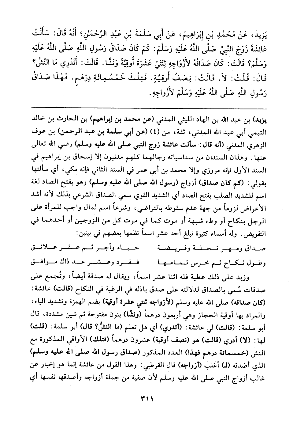يَزِيدَ، عَن مُحَمَّدِ بنِ إِبرَاهِيمَ، عَن أَبِي سَلَمَةَ بنِ عَبْدِ الرَّحمَنِ؟ أَنَّهُ قَال: سَألتُ عَائِشَةَ زَوجَ النبِي صَلَّى اللهُ عَلَيهِ وَسَلَّمَ: كَم كَانَ صَدَاقُ رَسُولِ اللهِ صَلى اللهُ عَلَيهِ وَسَلَّمَ؟ قَالت: كَانَ صَدَاقُهُ لأَزوَاجِهِ ثِنْتَي عَشرَةَ أُوقِيَّةً وَنَشًّا. قَالت: أَتَدْرِي مَا النَّشُّ؟ قَال: قُلْتُ: لَا. قَالت: نِصفُ أُوقِية. فَتِلكَ خَمسُمِائةِ دِرهَمٍ. فَهذَا صَدَاقُ رَسُولِ الله صَلَّى اللهُ عَلَيهِ وَسَلَّمَ لأَزواجِهِ