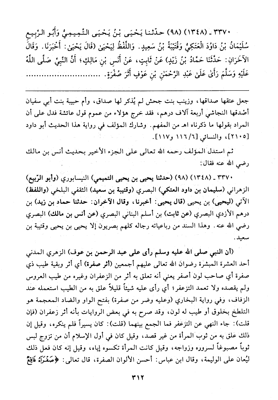 ٣٣٧٠ - (١٣٤٨) (٩٨) حدَّثنا يَحْيَى بْنُ يَحْيَى التَّمِيمِيُّ وَأَبُو الرَّبِيعِ سُلَيمَانُ بْنُ دَاوُدَ الْعَتَكِيُّ وَقُتَيبَةُ بْنُ سَعِيدٍ. وَاللَّفْظُ لِيَحْيَى (قَال يَحْيَى: أَخْبَرَنَا. وَقَال الآخَرَانِ: حَدَّثَنَا حَمَّادُ بْنُ زَيدٍ) عَنْ ثَابِتٍ، عَنْ أَنَسِ بْنِ مَالِكٍ؛ أَنَّ النَّبِيَّ صَلَّى اللهُ عَلَيهِ وَسَلَّمَ رَأَى عَلَى عَبْدِ الرَّحْمَنِ بْنِ عَوْفٍ أَثَرَ صُفْرَةٍ