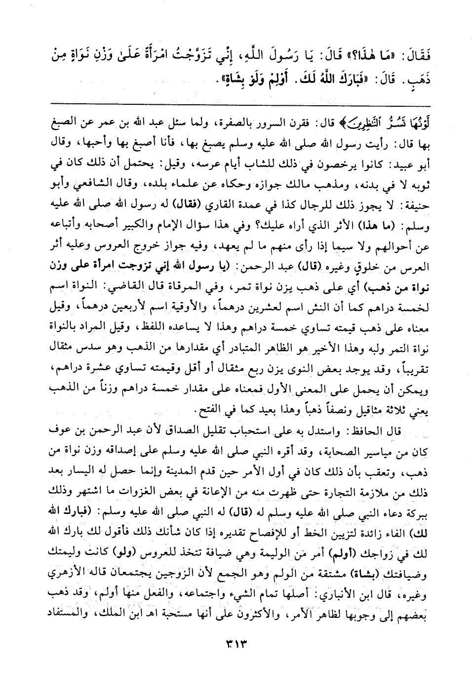فَقَال: "مَا هذَا؟ " قَال: يَا رَسُولَ اللهِ، إِنِّي تَزَوَّجْتُ امْرَأَةً عَلَى وَزْنِ نَوَاةٍ مِنْ ذَهَبٍ. قَال: "فَبَارَكَ اللهُ لَكَ. أَوْلِمْ وَلَوْ بِشَاةٍ"