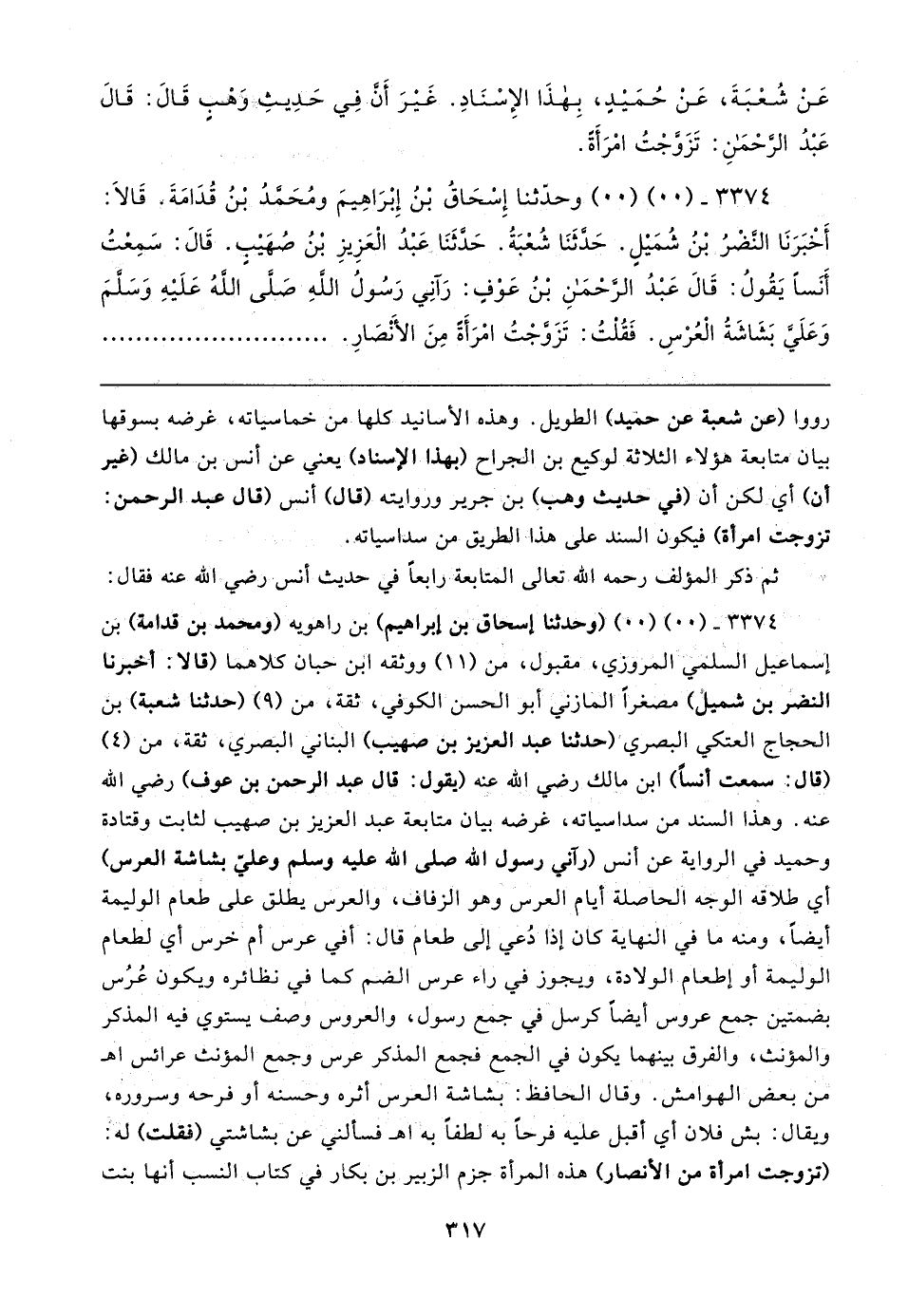 ٣٣٧٤ - (٠٠) (٠٠) وحدَّثنا إِسْحَاقُ بْنُ إِبْرَاهِيمَ ومُحَمَّدُ بْنُ قُدَامَةَ. قَالا: أَخْبَرَنَا النَّضْرُ بْنُ شُمَيلٍ. حَدَّثَنَا شُعْبَةُ. حَدَّثَنَا عَبْدُ الْعَزِيزِ بْنُ صُهَيبٍ. قَال: سَمِعْتُ أَنَسًا يَقُولُ: قَال عَبْدُ الرَّحْمَنِ بْنُ عَوْفٍ: رَآنِي رَسُولُ اللهِ صَلَّى اللهُ عَلَيهِ وَسَلَّمَ وَعَلَيَّ بَشَاشَةُ الْعُرْسِ. فَقُلْتُ: تَزَوَّجْتُ امْرَأَةً مِنَ الأنْصَارِ