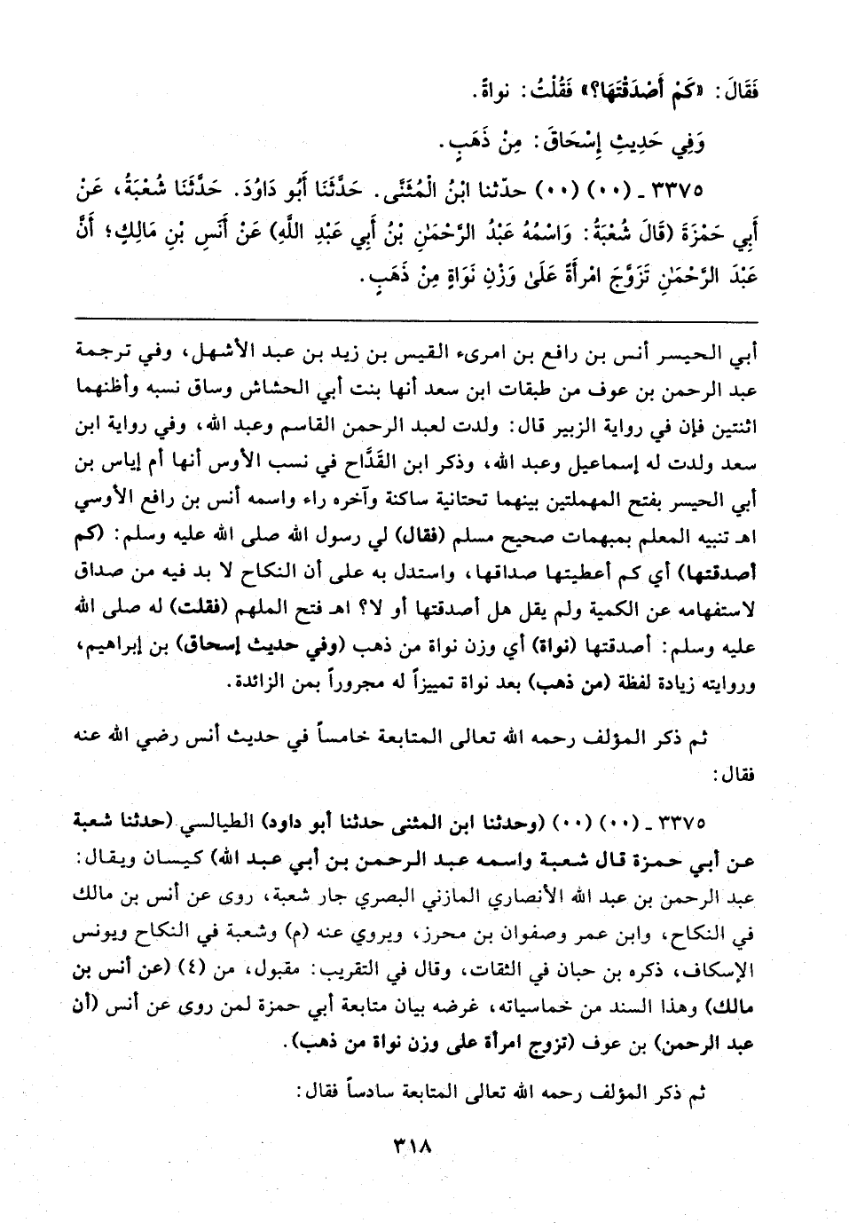 ٣٣٧٥ - (٠٠) (٠٠) (وحدثنا ابن المثنى حدثنا أبو داود) الطيالسي - (حدثنا شعبة عن أبي حمزة قال شعبة واسمه عبد الرحمن بن أبي عبد الله) كيسان ويقال: عبد الرحمن بن عبد الله الأنصاري المازني البصري جار شعبة، روى عن أنس بن مالك في النكاح، وابن عمر وصفوان بن محرز، ويروي عنه (م) وشعبة في النكاح ويونس الإسكاف، ذكره بن حبان في الثقات، وقال في التقريب: مقبول، من (٤) (عن أنس بن مالك) وهذا السند من خماسياته، غرضه بيان متابعة أبي حمزة لمن روى عن أنس (أن عبد الرحمن) بن عوف (تزوج امرأة على وزن نواة من ذهب).