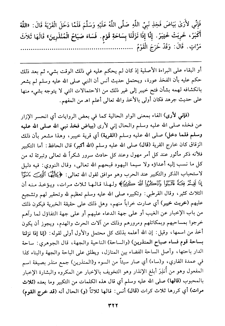 فَإنِّي لأرَى بَيَاضَ فَخِذِ نَبِي اللهِ صَلَّى اللهُ عَلَيهِ وَسَلَّمَ فَلَمَّا دَخَلَ الْقَرْيَةَ قَال: "اللهُ أَكْبَرُ، خَرِبَتْ خَيبَرُ. إنَّا إِذَا نَزَلْنَا بِسَاحَةِ قَوْمٍ. فَسَاءَ صَبَاحُ الْمُنْذَرِينَ" قَالهَا ثَلاثَ مَرَّاتٍ. قَال: وَقَدْ خَرَجَ الْقَوْمُ