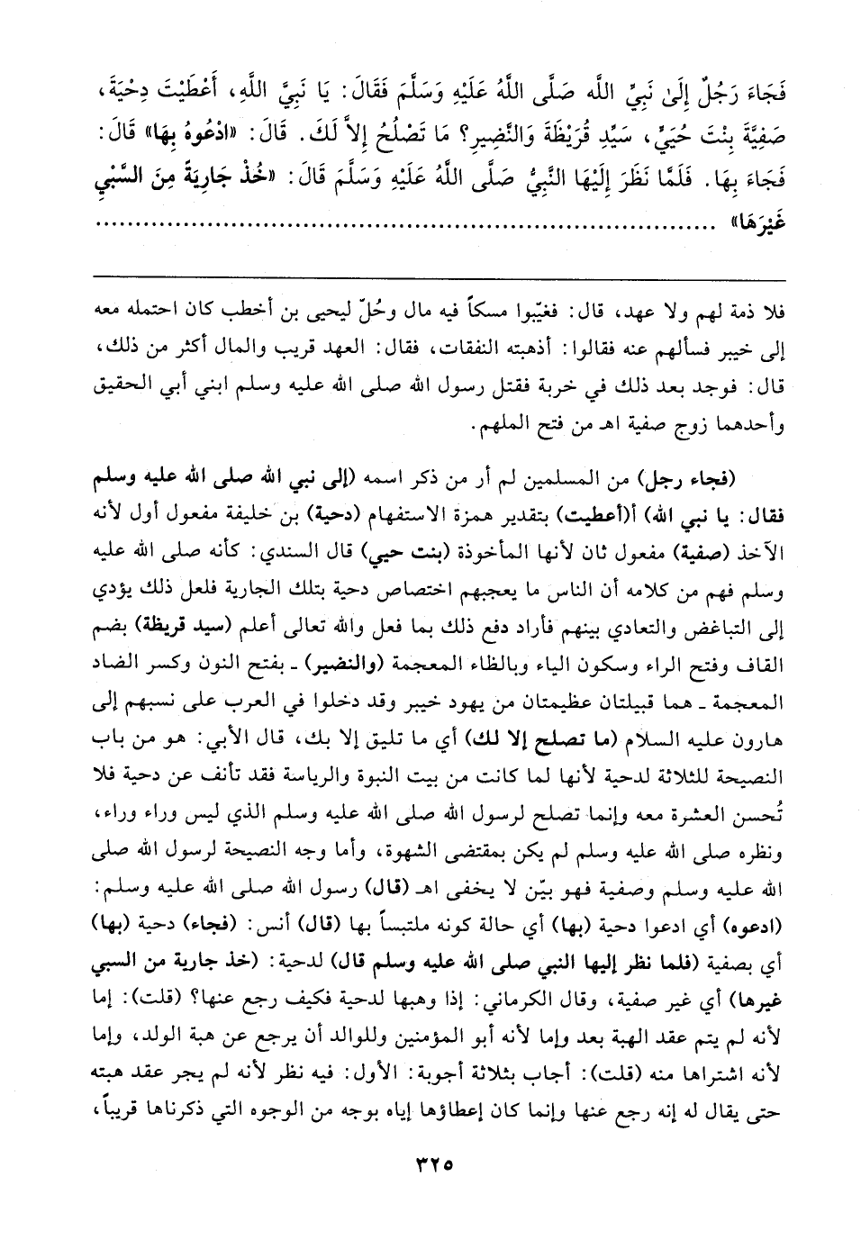 فَجَاءَ رَجُلٌ إِلَى نَبِيِّ الله صَلَّى اللهُ عَلَيهِ وَسَلَّمَ فَقَال: يَا نَبِيَّ اللهِ، أَعْطَيتَ دِحْيَةَ، صَفِيةَ بِنْتَ حُيَيٍّ، سَيِّدِ قُرَيظَةَ وَالنَّضيرِ؟ مَا تَصْلُحُ إِلَّا لَكَ. قَال: "ادْعُوهُ بِهَا" قَال: فَجَاءَ بِهَا. فَلَمَّا نَظَرَ إِلَيهَا النَّبِيُّ صَلَّى اللهُ عَلَيهِ وَسَلَّمَ قَال: "خُذْ جَارِيَةً مِنَ السَّبْيِ غَيرَهَا"