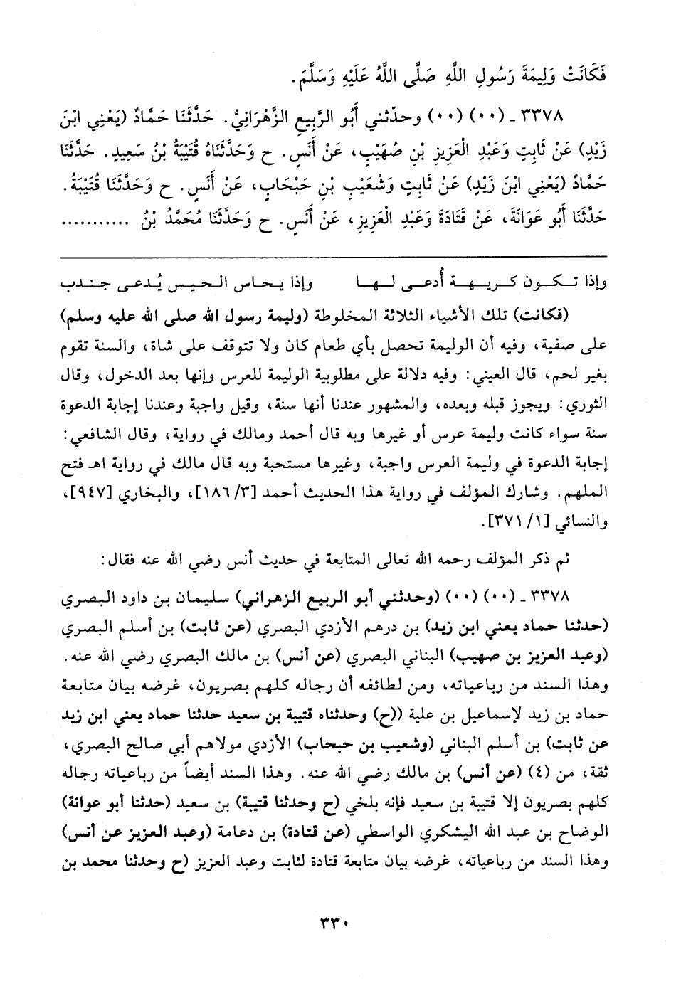 ٣٣٧٨ - (٠٠) (٠٠) (وحدثني أبو الربيع الزهراني) سليمان بن داود البصري (حَدَّثَنَا حماد يعني ابن زيد) بن درهم الأزدي البصري (عن ثابت) بن أسلم البصري (وعبد العزيز بن صهيب) البناني البصري (عن أنس) بن مالك البصري رضي الله عنه. وهذا السند من رباعياته، ومن لطائفه أن رجاله كلهم بصريون، غرضه بيان متابعة حماد بن زيد لإسماعيل بن علية (ح) وحدثناه قتيبة بن سعيد حَدَّثَنَا حماد يعني ابن زيد عن ثابت) بن أسلم البناني (وشعبب بن حبحاب) الأزدي مولاهم أبي صالح البصري، ثقة، من (٤) (عن أنس) بن مالك رضي الله عنه. وهذا السند أيضًا من رباعياته رجاله كلهم بصريون إلَّا قتيبة بن سعيد فإنه بلخي (ح وحدثنا قتيبة) بن سعيد (حَدَّثَنَا أبو عوانة) الوضاح بن عبد الله اليشكري الواسطي (عن قتادة) بن دعامة (وعبد العزيز عن أنس) وهذا السند من رباعياته، غرضه بيان متابعة قتادة لثابت وعبد العزيز (ح وحدثنا محمد بن