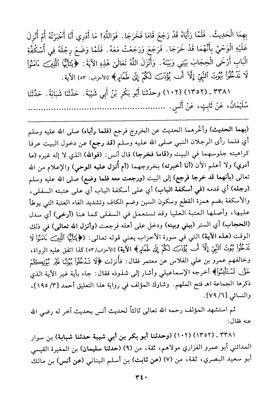 ٣٣٨١ - (١٣٥٢) (١٠٢) (وحدثنا أبو بكر بن أبي شيبة حَدَّثَنَا شبابة) بن سوار المدائني أبو عمرو الفزاري مولاهم، ثقة، من (٩) (حَدَّثَنَا سليمان) بن المغيرة القيسي أبو سعيد البصري، ثقة، من (٧) (عن ثابت) بن أسلم البناني (عن أنس) بن مالك