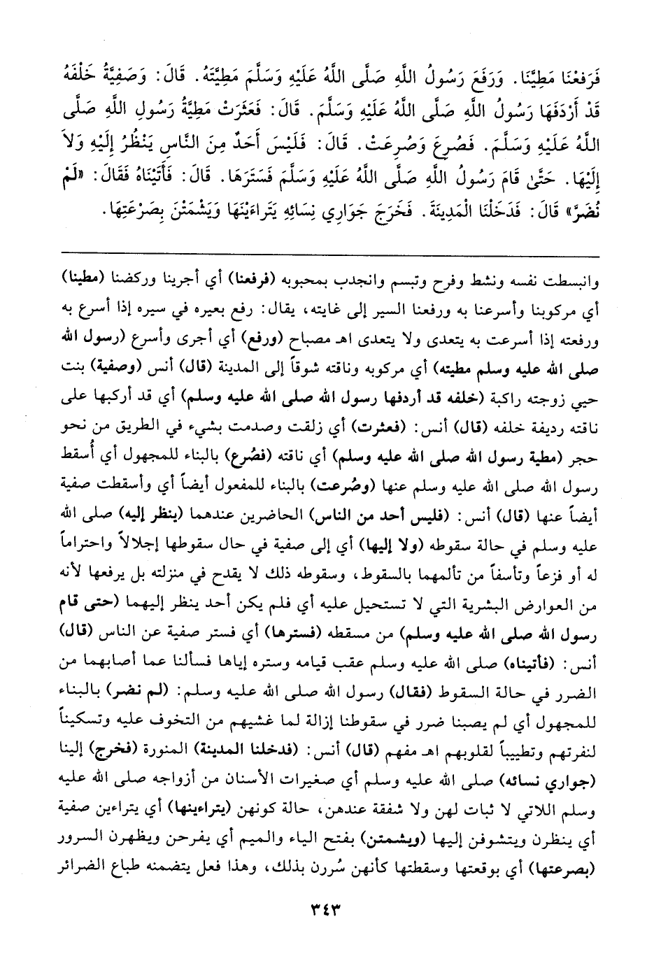 فَرَفعْنَا مَطِيِّنَا. وَرَفَعَ رَسُولُ اللهِ صَلَّى اللهُ عَلَيهِ وَسَلَّمَ مَطِيَّتَهُ. قَال: وَصَفِيَّةُ خَلْفَهُ قَدْ أَرْدَفَهَا رَسُولُ اللهِ صَلَّى اللهُ عَلَيهِ وَسَلَّمَ. قَال: فَعَثَرَتْ مَطِيَّةُ رَسُولِ اللهِ صَلَّى اللهُ عَلَيهِ وَسَلَّمَ. فَصُرعَ وَصُرِعَتْ. قَال: فَلَيسَ أَحَدٌ مِنَ النَّاسِ يَنْظُرُ إِلَيهِ وَلَا إِلَيهَا. حَتَّى قَامَ رَسُولُ اللهِ صَلَّى اللهُ عَلَيهِ وَسَلَّمَ فَسَتَرَهَا. قَال: فَأَتَينَاهُ فَقَال: "لَمْ نُضَرَّ" قَال: فَدَخَلْنَا الْمَدِينَةَ. فَخَرَجَ جَوَارِى نِسَائِهِ يَتَراءَينَهَا وَيَشْمَتْنَ بِصَرْعَتِهَا