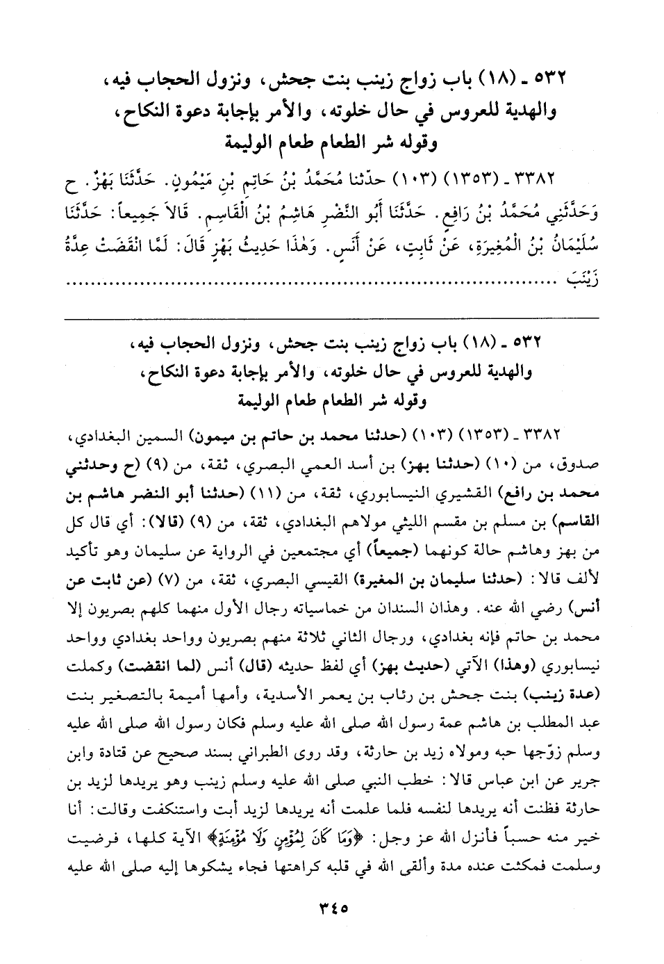 ٣٣٨٢ - (١٣٥٣) (١٠٣) (حَدَّثَنَا محمد بن حاتم بن ميمون) السمين البغدادي، صدوق، من (١٠) (حَدَّثَنَا بهز) بن أسد العمي البصري، ثقة، من (٩) (ح وحدثني محمد بن رافع) القشيري النيسابوري، ثقة، من (١١) (حَدَّثَنَا أبو النضر هاشم بن القاسم) بن مسلم بن مقسم الليثي مولاهم البغدادي، ثقة، من (٩) (قالا): أي قال كل من بهز وهاشم حالة كونهما (جميعًا) أي مجتمعين في الرواية عن سليمان وهو تأكيد لألف قالا: (حَدَّثَنَا سليمان بن المغيرة) القيسي البصري، ثقة، من (٧) (عن ثابت عن أنس) رضي الله عنه. وهذان السندان من خماسياته رجال الأول منهما كلهم بصريون إلَّا محمد بن حاتم فإنه بغدادي، ورجال الثاني ثلاثة منهم بصريون وواحد بغدادي وواحد نيسابوري (وهذا) الآتي (حديث بهز) أي لفظ حديثه (قال) أنس (لما انقضت) وكملت (عدة زينب) بنت جحش بن رئاب بن يعمر الأسدية، وأمها أميمة بالتصغير بنت عبد المطلب بن هاشم عمة رسول الله صلى الله عليه وسلم فكان رسول الله صلى الله عليه وسلم زوّجها حبه ومولاه زيد بن حارثة، وقد روى الطبراني بسند صحيح عن قتادة وابن جرير عن ابن عباس قالا: خطب النبي صلى الله عليه وسلم زينب وهو يريدها لزيد بن حارثة فظنت أنَّه يريدها لنفسه فلما علمت أنَّه يريدها لزيد أبت واستنكفت وقالت: أنا خير منه حسبًا فأنزل الله عزَّ وجلَّ: {وَمَا كَانَ لِمُؤْمِنٍ وَلَا مُؤْمِنَةٍ} الآية كلها، فرضيت وسلمت فمكثت عنده مدة وألقى الله في قلبه كراهتها فجاء يشكوها إليه صلى الله عليه
