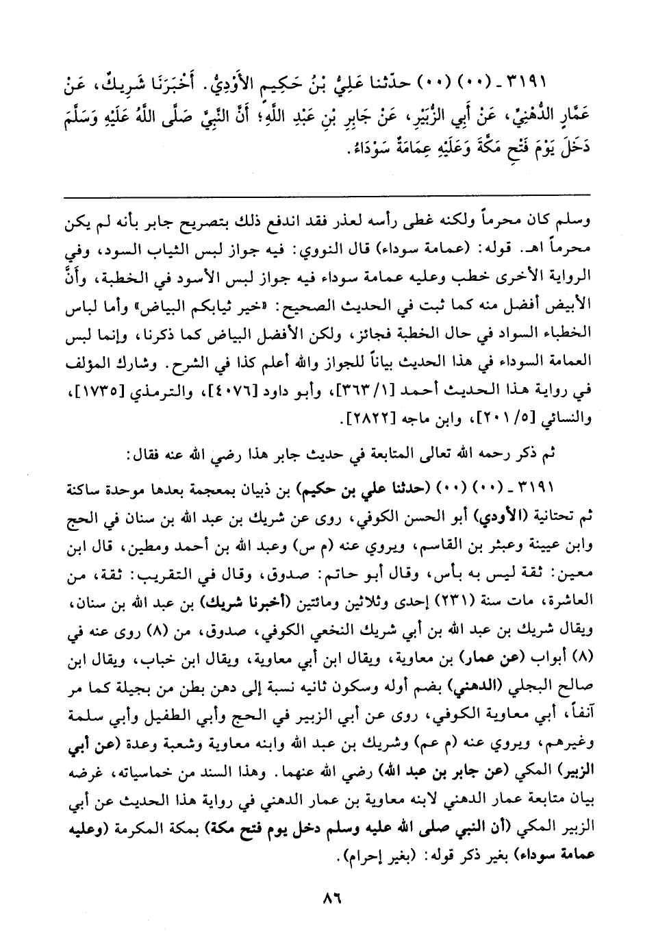 ٣١٩١ - (٠٠) (٠٠) حدَّثنا عَلِيُّ بْنُ حَكِيمِ الأَوْدِيُّ. أَخْبَرَنَا شَرِيكٌ، عَنْ عَمَّارٍ الدُّهْنِيِّ، عن أَبِي الزُّبَيرِ، عَنْ جَابِرِ بْنِ عَبْدِ الله؛ أَنَّ النَّبِيَّ صَلَّى الله عَلَيهِ وَسَلَّمَ دَخَلَ يَوْمَ فَتْحِ مَكَّةَ وَعَلَيهِ عِمَامَةٌ سَوْدَاءُ