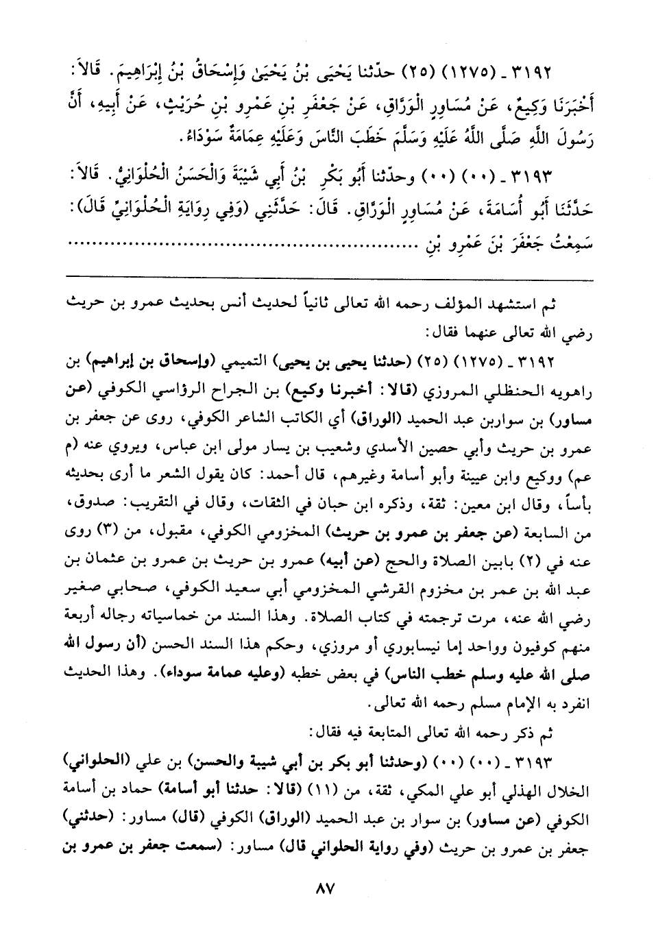 ٣١٩٢ - (١٢٧٥) (٢٥) حدَّثنا يَحيَى بن يَحيَى وَإسْحَاقُ بن إِبْرَاهِيمَ. قَالا: أَخْبَرَنَا وَكِيعٌ، عن مُسَاورٍ الْوَرَّاقِ، عن جَعْفَرِ بْنِ عَمرِو بْنِ حُرَيثٍ، عَنْ أَبِيهِ، أَنَّ رَسُولَ الله صَلَّى الله عَلَيهِ وَسلَّمَ خَطَبَ النَّاسَ وَعَلَيهِ عِمَامَةٌ سَوْدَاءُ.