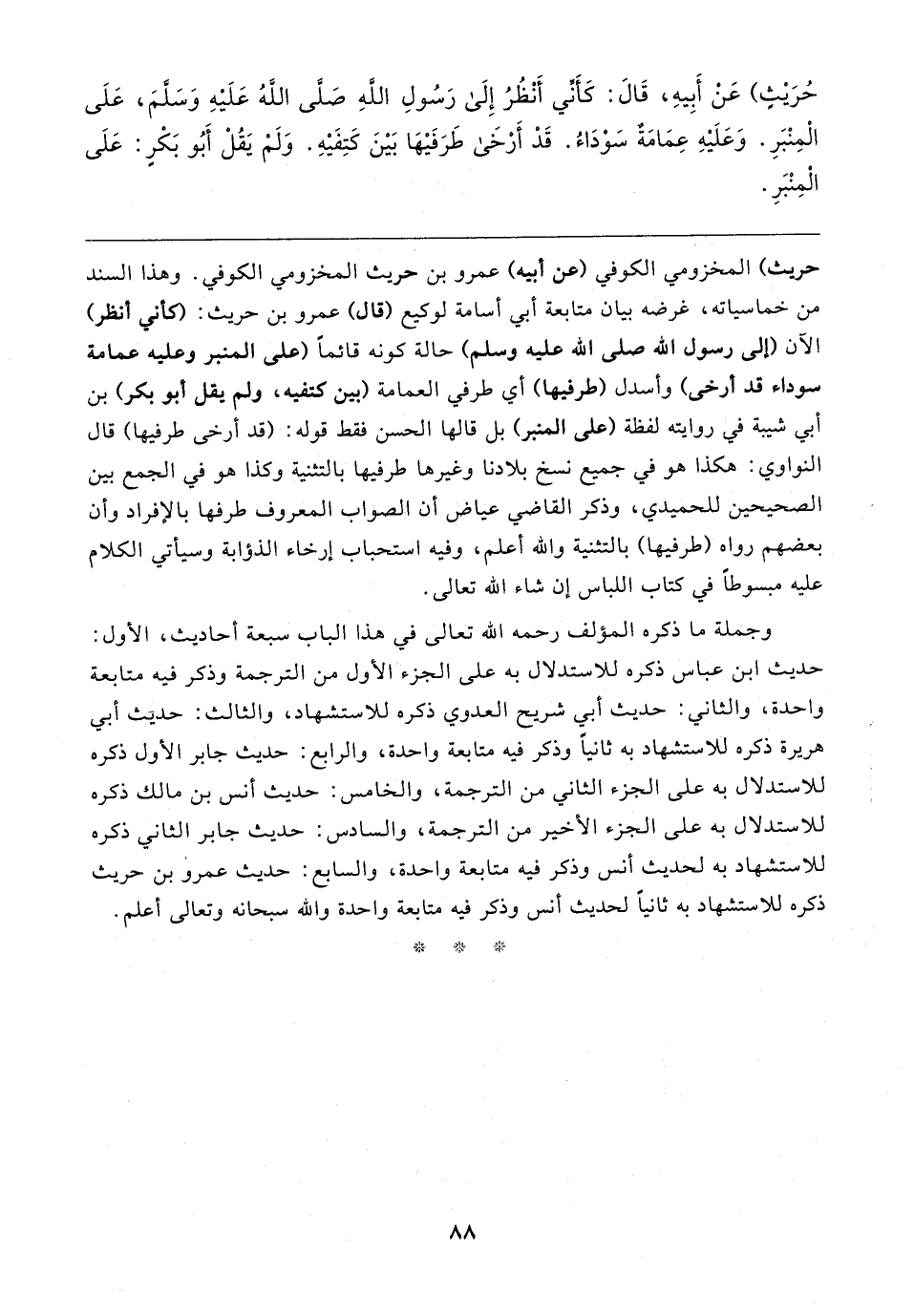 حُرَيثٍ) عَنْ أَبِيهِ، قَال: كَأَنِّي أَنْظُرُ إِلَى رَسُولِ الله صَلَّى اللهُ عَلَيهِ وَسَلَّمَ، عَلَى الْمِنْبَرِ. وَعَلَيهِ عِمَامَةٌ سَوْدَاءُ. قَدْ أَرْخَى طَرَفَيها بَينَ كَتِفَيهِ. وَلَم يَقُلْ أَبُو بَكْرٍ: عَلَى الْمِنْبَرِ