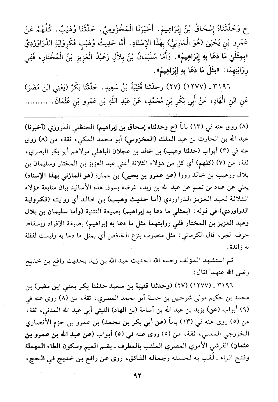٣١٩٦ - (١٢٧٧) (٢٧) (وحدثنا قتيبة بن سعيد حدثنا بكر يعني ابن مضر) بن محمد بن حكيم مولى شرحبيل بن حسنة أبو محمد المصري، ثقة، من (٨) روى عنه في (٩) أبواب (عن) يزيد بن عبد الله بن أسامة (بن الهاد) الليثي أبي عبد الله المدني، ثقة، من (٥) روى عنه في (١٣) بابا (عن أبي بكر بن محمد) بن عمرو بن حزم الأنصاري الخزرجي المدني، ثقة، من (٥) روى عنه في (٥) أبواب (عن عبد الله بن عمرو بن عثمان) القرشي الأموي المصري الملقب بالمطرف -بضم الميم وسكون الطاء المهملة وفتح الراء- لُقب به لحسنه وجماله الفائق، روى عن راقع بن خديج في الحج،