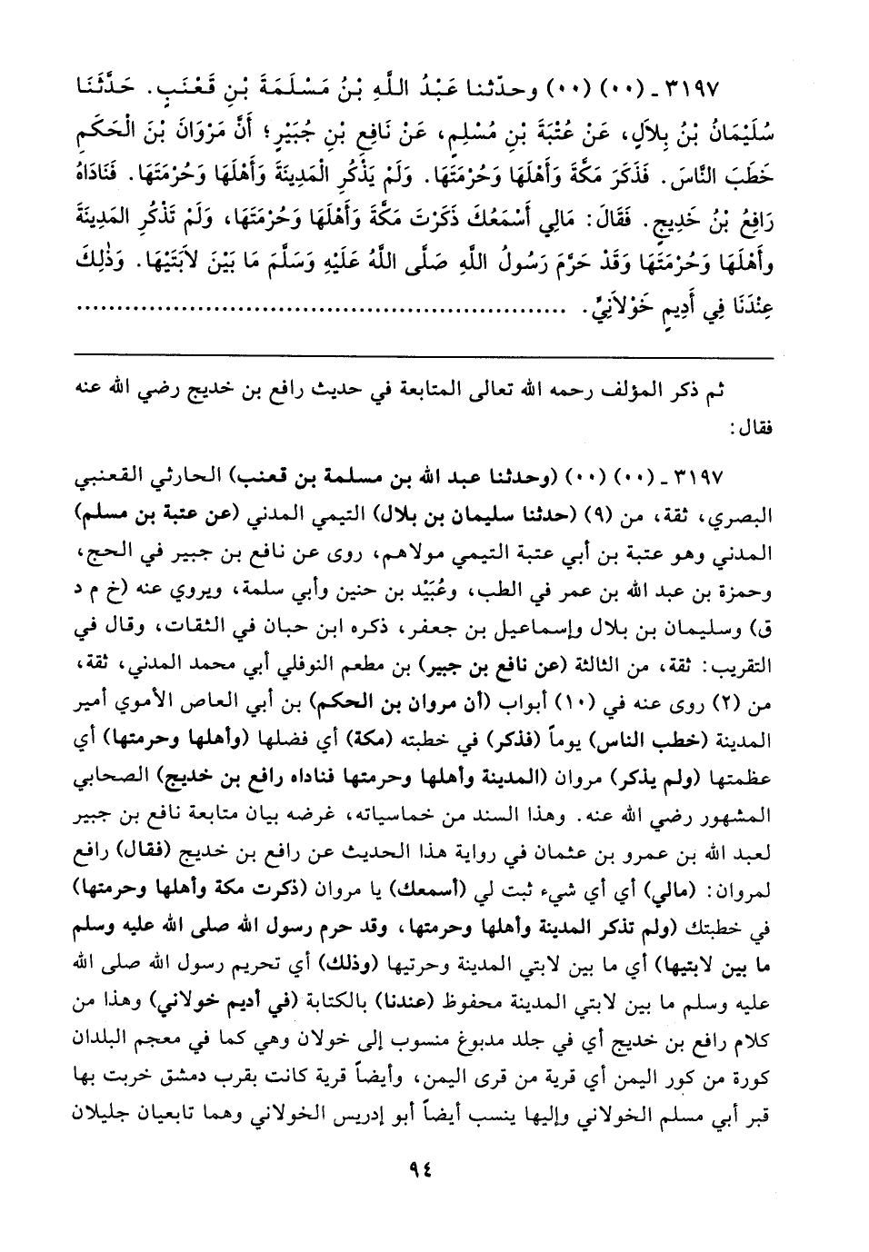 ٣١٩٧ - (٠٠) (٠٠) (وحدثنا عبد الله بن مسلمة بن قعنب) الحارثي القعنبي البصري، ثقة، من (٩) (حدثنا سليمان بن بلال) التيمي المدني (عن عتبة بن مسلم) المدني وهو عتبة بن أبي عتبة التيمي مولاهم، روى عن نافع بن جبير في الحج، وحمزة بن عبد الله بن عمر في الطب، وعُبَيد بن حنين وأبي سلمة، ويروي عنه (خ م د ق) وسليمان بن بلال وإسماعيل بن جعفر، ذكره ابن حبان في الثقات، وقال في التقريب: ثقة، من الثالثة (عن نافع بن جبير) بن مطعم النوفلي أبي محمد المدني، ثقة، من (٢) روى عنه في (١٠) أبواب (أن مروان بن الحكم) بن أبي العاص الأموي أمير المدينة (خطب الناس) يومًا (فذكر) في خطبته (مكة) أي فضلها (وأهلها وحرمتها) أي عظمتها (ولم يذكر) مروان (المدينة وأهلها وحرمتها فناداه رافع بن خديج) الصحابي المشهور رضي الله عنه. وهذا السند من خماسياته، غرضه بيان متابعة نافع بن جبير لعبد الله بن عمرو بن عثمان في رواية هذا الحديث عن رافع بن خديج (فقال) رافع لمروان: (ما لي) أي أي شيء ثبت في (أسمعك) يا مروان (ذكرت مكة وأهلها وحرمتها) في خطبتك (ولم تذكر المدينة وأهلها وحرمتها، وقد حرم رسول الله صلى الله عليه وسلم ما بين لابتيها) أي ما بين لابتي المدينة وحرتيها (وذلك) أي تحريم رسول الله صلى الله عليه وسلم ما بين لابتي المدينة محفوظ (عندنا) بالكتابة (في أديم خولاني) وهذا من كلام رافع بن خديج أي في جلد مدبوغ منسوب إلى خولان وهي كما في معجم البلدان كورة من كور اليمن أي قرية من قرى اليمن، وأيضًا قرية كانت بقرب دمشق خربت بها قبر أبي مسلم الخولاني وإليها ينسب أيضًا أبو إدريس الخولاني وهما تابعيان جليلان
