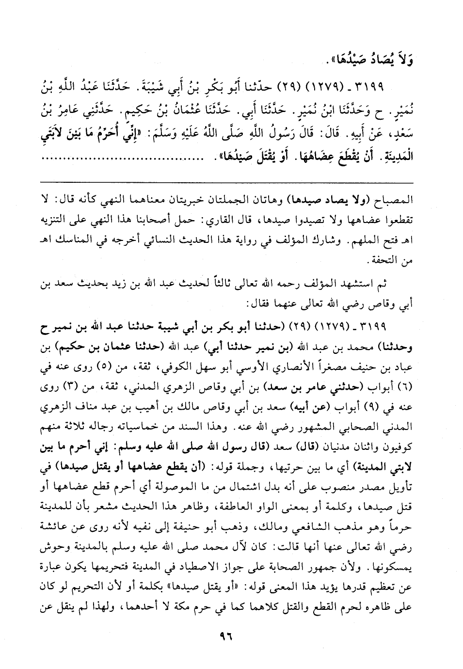 ٣١٩٩ - (١٢٧٩) (٢٩) حدَّثنا أَبُو بَكْرِ بْنُ أَبِي شَيبَةَ. حَدَّثَنَا عَبْدُ الله بْنُ نُمَيرٍ. ح وَحَدَّثَنَا ابْنُ نُمَيرٍ. حَدَّثَنَا أَبِي. حَدَّثَنَا عُثْمَانُ بْنُ حَكِيمٍ. حَدَّثَنِي عَامِرُ بْنُ سَعْدٍ، عَنْ أَبِيهِ. قَال: قَال رَسُولُ اللهِ صَلَّى الله عَلَيهِ وَسلَّمَ: "إنِّي أُحَرِّمُ مَا بَينَ لابَتَيِ الْمَدِينَةِ. أَنْ يُقْطَعَ عِضَاهُها. أَوْ يُقْتَلَ صَيدُها"