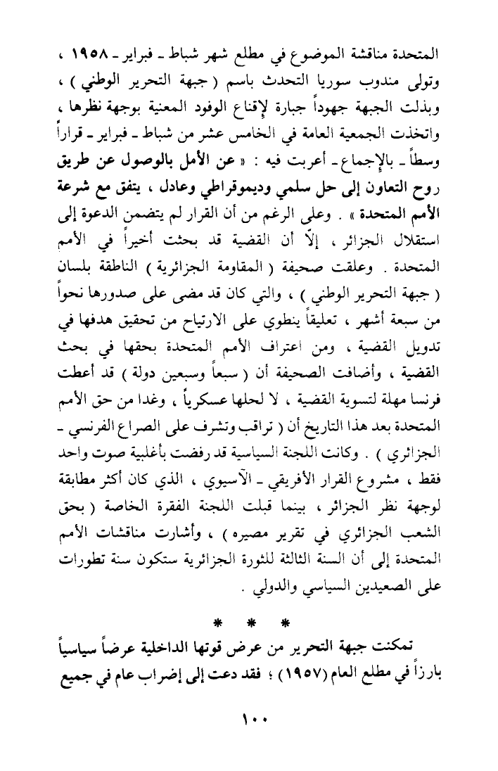 المتحدة مناقشة الموضوع في مطلع شهر شباط - فبراير - 1958، وتولى مندوب سوريا التحدث باسم (جبهة التحرير الوطني)، وبذلت الجبهة جهودا جبارة لإقناع الوفود المعنية بوجهة نظرها، واتخذت الجمعية العامة في الخامس عشر من شباط - فبراير - قرارا وسطا - بالإجماع - أعربت فيه: (عن الأمل بالوصول عن طريق روح التعاون إلى حل سلمي وديموقراطي وعادل، يتفق مع شرعة الأمم المتحدة). وعلى الرغم من أن القرار لم يتضمن الدعوة إلى استقلال الجزائر، إلا أن القضية قد بحثت اخيرا في الأمم المتحدة. وعلقت صحيفة (المقاومة الجزائرية) الناطقة بلسان (جبهة التحرير الوطني)، والتي كان قد مضى على صدورها نحوا من سبعة أشهر، تعليقا ينطوي على الارتياح من تحقيق هدفها في تدويل القضية، ومن اعتراف الأمم المتحدة بحقها في بحث القضية، وأضافت الصحيفة أن (سبعا وسبعين دولة) قد أعطت فرنسا مهلة لتسوية القضية، لا لحلها عسكريا، وغدا من حق الأمم المتحدة بعد هذا التاريخ أن (تراقب وتشرف على الصراع الفرنسي - الجزائري). وكانت اللجنة السياسية قد رفضت بأغلبية صوت واحد فقط، شروع القرار الأفريقي - الآسيوي، الذي كان أكثر مطابقة لوجهة نظر الجزائر، بينما قبلت اللجنة الفقرة الخاصة (بحق الشعب الجزائري في تقرير مصيره)، وأشارت مناقشات الأمم المتحدة إلى أن السنة الثالثة للثورة الجزائرية ستكون سنة تطورات على الصعيدين السياسي والدولي.