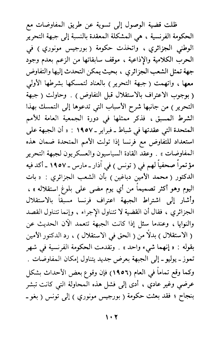 الوطني الجزائري، واتخذت حكومة (بورجيس مرنوري) في الحرب الكلامية والإذاعية، موقف سابقاتها من الزعم بعدم وجود جهة تمثل الشعب الجزائري، بحيث يمكن التحدث إليها والتفاوض معها، واتهمت (جبهة التحرير) بالعناد لتمسكها بشرطها الأولي (بوجوب الاعتراف بالاستقلال قبل التفاوض). وحاولت (جبهة التحرير) من جانبها شرح الأسباب التي تدعوها إلى التمسك بهذا الشرط المسبق، فذكر ممثلها في دورة الجمعية العامة للأمم المتحدة التي عقدتها في شباط - فبراير - 1957: (أن الجبهة على استعداد للتفاوض مع فرنسا إذا تولت الأمم المتحدة ضمان هذه المفاوضات). وعقد القادة السياسيون والعسكريون لجبهة التحرير مؤتمرا صحفيا لهم في (تونس) في آذار - مارس - 1957 - أكد فيه الدكتور (محمد الأمين دباغين) بأن الشعب الجزائري: (بات اليوم وهو أكثر تصميما من أي يوم مضى على بلوغ استقلاله،، وأشار إلى اشتراط الجبهة اعتراف فرنسا مسبقاء بالاستقلال الجزائري، فقال أن القضية لا تتناول الإجراء، وإنما تتناول القصد والنوايا، وعندما سئل إذا كانت الجبهة تتعمد الآن الحديث عن (الاستقلال) بدلا من (الحق في الاستقلال)، رد الدكتور الأمين بقوله: (إنهما شيء واحد). وتقدمت الحكومة الفرنسية في شهر تموز - يوليو - إلى الجبهة بعرض جديد يتناول إمكان المفاوضات. وكما وقع تماما في العام (1956) فإن وقوع بعض الأحداث شكل عرضي وغير عادي، أدى إلى فشل هذه المحاولة التي كانت تبشر بنجاح؛ فقد بعثت حكومة (بورجيس مونوري) إلى تونس (بغو -