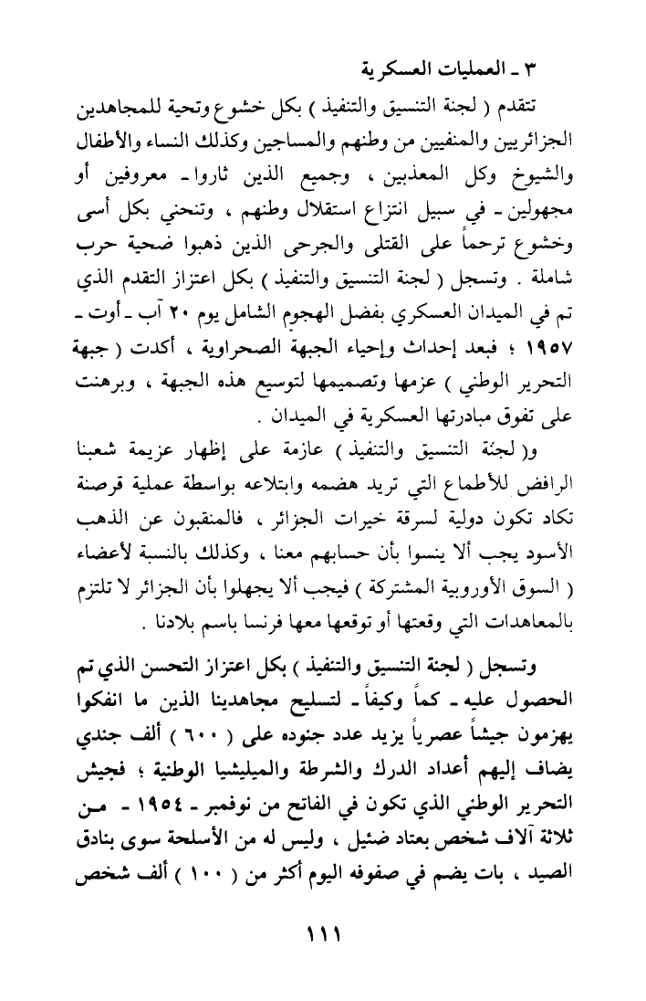 وتسجل (لجنة التنسيق والتنفيذ) بكل اعتزاز التحسن الذي تم الحصول عليه - كما وكيفا - لتسليح مجاهدينا الذين ما انفكوا يهزمون جيشا عصريا يزيد عدد جنوده على (600) ألف جندي يضاف إليهم أعداد الدرك والشرطة والميليشيا الوطنية؛ فجيش وطني الذي تكون في الفاتح من نوفمبر - 1954 - من ثلاثة آلاف شخص بعتاد ضئيل، وليس له من الأسلحة سوى بنادق الصيد، بات يضم في صفوفه اليوم أكثر من (100) ألف شخص
