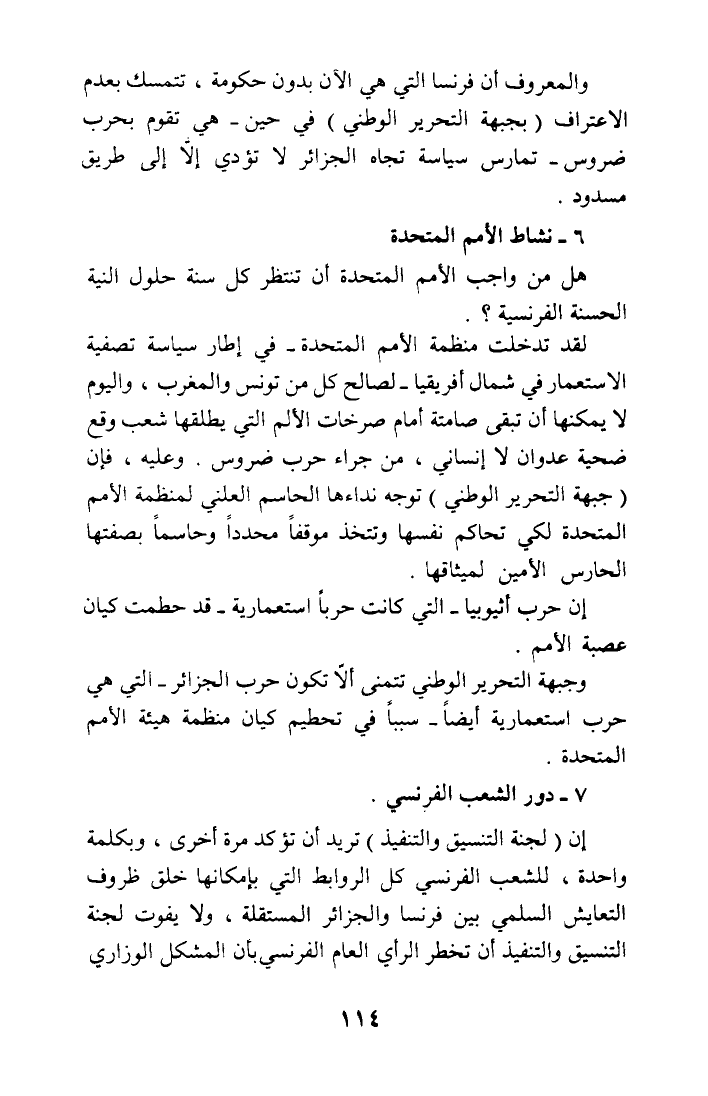 والمعروف أن فرنسا التي هي الآن بدون حكومة، تتمسك بعدم الاعتراف (بجبهة التحرير الوطني) في حين - هي تقوم بحرب ضروس - تمارس سياسة تجاه الجزائر لا تؤدي إلا إلى طريق مسدود.