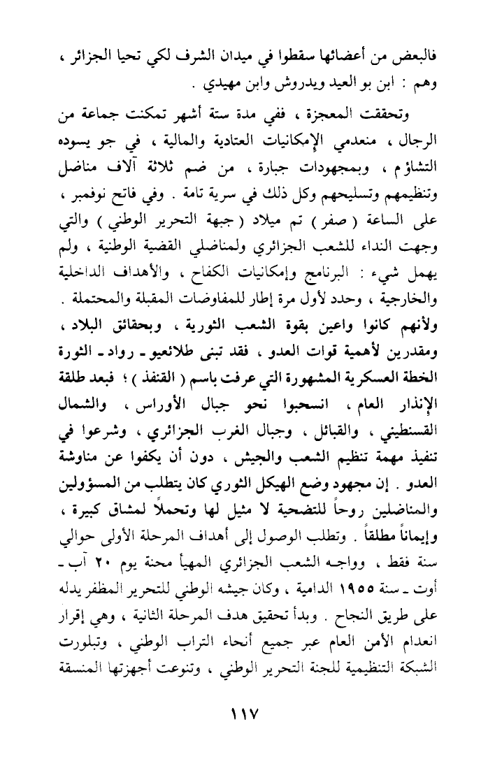 وتحققت المعجزة، ففي مدة ستة أشهر تمكنت جماعة من الرجال، منعدمي الإمكانيات العتادية والمالية، في جو يسوده التشاؤم، وبمجهودات جبارة، من ضم ثلاثة آلاف مناضل وتنظيمهم وتسليحهم وكل ذلك في سرية تامة. وفي فاتح نوفمبر، على الساعة (صفر) تم ميلاد (جبهة التحرير الوطني) والتي وجهت النداء للشعب الجزائري ولمناضلي القضية الوطنية، ولم يهمل شيء: البرنامج وإمكانيات الكفاح، والأهداف الداخلية والخارجية، وحدد لأول مرة إطار للمفاوضات المقبلة والمحتملة ولأنهم كانوا واعين بقوة الشعب الثورية، وبحقائق البلاد، ومقدرين لأهمية قوات العدو، فقد تبنى طلائعيو - رواد - الثورة الخطة العسكرية المشهورة التي عرفت باسم (القنفذ)؛ فبعد طلقة الإنذار العام، انسحبوا نحو جبال الأوراس، والشمال القسنطيني، والقبائل، وجبال الغرب الجزائري، وشرعوا في تنفيذ مهمة تنظيم الشعب والجيش، دون أن يكفوا عن مناوشة العدو. إن مجهود وضع الهيكل الثوري كان يتطلب من المسؤولين والمناضلين روحا للتضحية لا مثيل لها وتحملا لمشاق كبيرة، وإيمانا مطلقا. وتطلب الوصول إلى أهداف المرحلة الأولى حوالي سنة فقط، وواجه الشعب الجزائري المهيأ محنة يوم 20 آب - أوت - سنة 1955 الدامية، وكان جيشه الوطني للتحرير المظفر يدله على طريق النجاح. وبدأ تحقيق هدف المرحلة الثانية، وهي إقرار انعدام الأمن العام عبر جميع أنحاء التراب الوطني، وتبلورت الشبكة التنظيمية للجنة التحرير الوطني، وتنوعت أجهزتها المنسقة