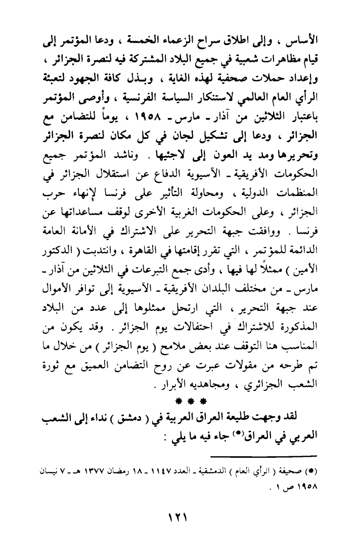 (*) صحيفة (الرأي العام) الدمشقية - العدد 1147 - 18 رمضان 1377 هـ - 7 نيسان 1958 ص 1.