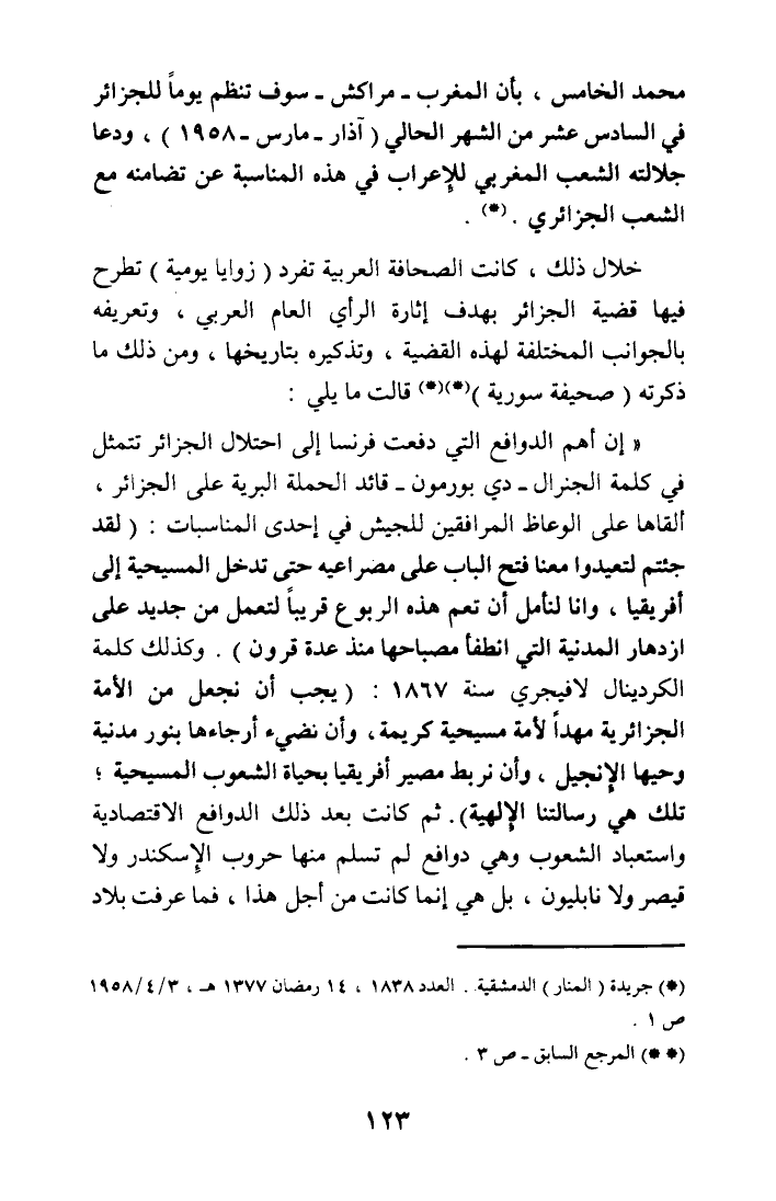 (إن أهم الدوافع التي دفعت فرنسا إلى احتلال الجزائر تتمثل في كلمة الجنرال - دي بورمون - قائد الحملة البرية على الجزائر، ألقاها على الوعاظ المرافقين للجيش في إحدى المناسبات: (لقد جئتم لتعيدوا معنا فتح الباب على مصراعيه حتى تدخل المسيحية إلى أفريقيا، وانا لنأمل أن تمم هذه الربوع قريبا لتعمل من جديد على ازدهار المدنية التي انطفأ مصباحها منذ عدة قرون). وكذلك كلمة الكردينال لافيجري سنة 1867: (يجب أن نجعل من الأمة الجزائرية مهدا لأمة مسيحية كريمة، وأن نضيء أرجاءها بنور مدنية وحيها الإنجيل، وأن نربط مصير أفريقيا بحياة الشعوب المسيحية؛ تلك هي رسالتنا الإلهية). ثم كانت بعد ذلك الدوافع الاقتصادية واستعباد الشعوب وهي دوافع لم تسلم منها حروب الإسكندر ولا قيصر ولا نابليون، بل هي إنما كانت من أجل هذا، فما عرفت بلاد