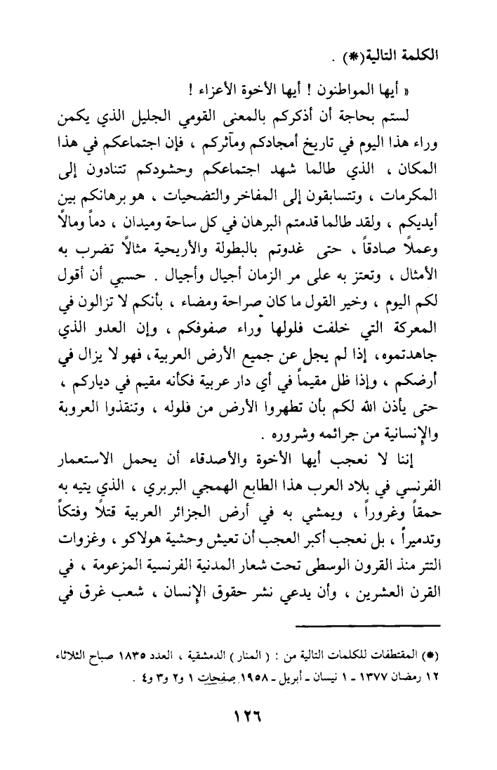 إننا لا نعجب أيها الأخوة والأصدقاء أن يحمل الاستعمار الفرنسي في بلاد العرب هذا الطابع الهمجي البربري، الذي يتيه به حمقا وغرورا، ويمشي به في أرض الجزائر العربية قتلا وفتكا وتدميرا، بل نعجب أكبر العجب أن تعيش وحشية هولاكو، وغزوات التتر منذ القرون الوسطى تحت شعار المدنية الفرنسية المزعومة، في القرن العشرين، وأن يدعي نشر حقوق الإنسان، شعب غرق في
