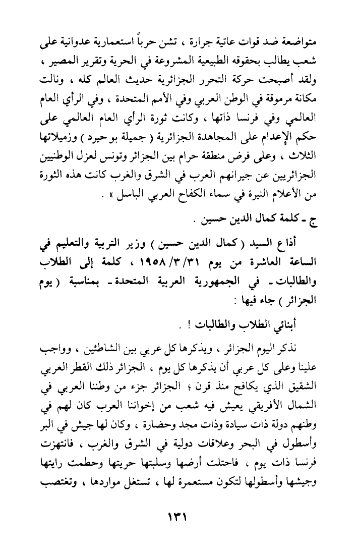أذاع السيد (كمال الدين حسين) وزير التربية والتعليم في الساعة العاشرة من يوم 31/ 3/ 1958، كلمة إلى الطلاب والطالبات - في الجمهورية العربية المتحدة - بمناسبة (يوم الجزائر) جاء فيها: