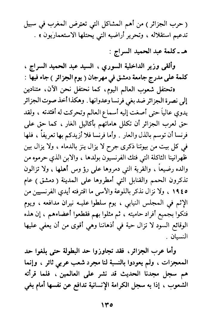 (تحتفل شعوب العالم اليوم، كما نحتفل نحن الآن، متنادين إلى نصرة الجزائر ضد بغي فرنسا وعدوانها. وهكذا أخد صوت الجزائر يدوي عاليا حتى أصغت إليه أسماع العالم وتحركت له افئدته، ولقد حق لعرب الجزائر أن تكلل هاماتهم بأكاليل الغار، كما حق على فرنسا أن توسم بالذل والعار. وأما فرنسا فلا أزيدكم بها تعريفا، فلها في كل بيت من بيوتنا ذكرى جرح لا يزال ينز بالدماء، ولا يزال بين ظهرانينا الثاكلة التي فتك الفرنسيون بولدها، والابن الذي حرموه من والده رضيعا، والقرية التي دمروها على رؤوس اهيلها، ولا تزالون تذكرون الحمم والقنابل التي أمطروها على المدينة (دمشق) عام 1945، ولا نزال نذكر باللوعة والأسى ما اقترفته أيدي الفرنسيين من الإثم في المجلس النيابي، يوم سلطوا عليه نيران مدافعه، ويوم فتكوا بجميع أفراد حاميته، ثم مثلوا بهم فقطعوا أعضاءهم، إن هذه الوقائع السود لا تزال حية في أذهاننا وهي أقوى من أن يعفي عليها النسيان.