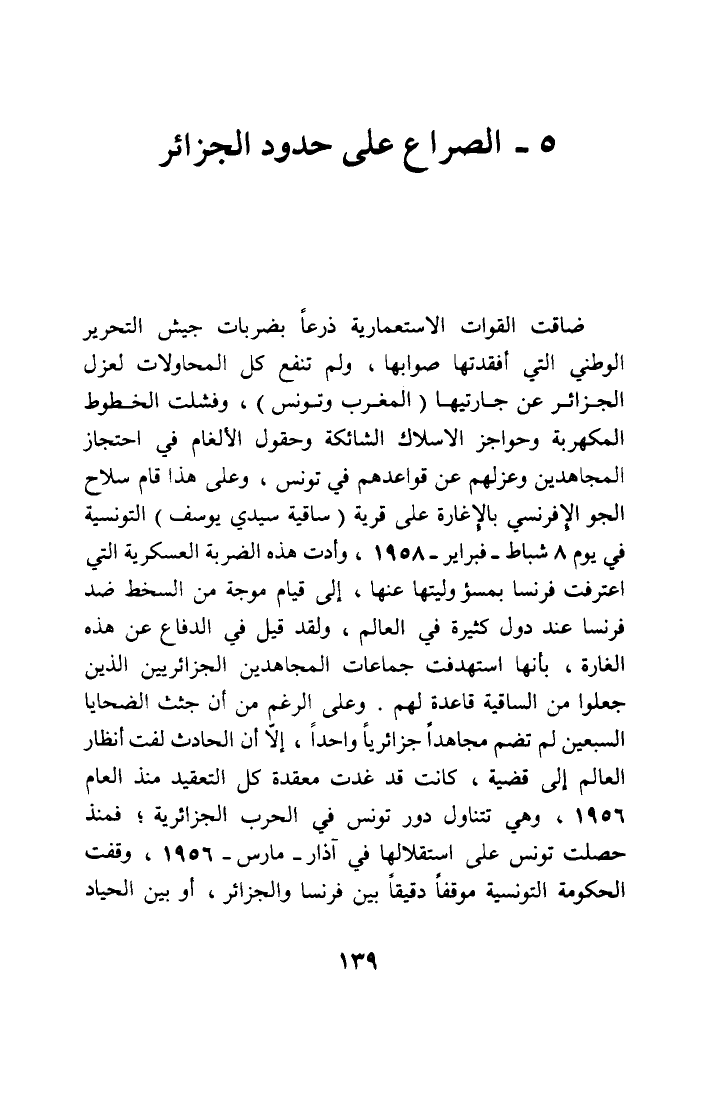 ضاقت القوات الاستعمارية ذرعا بضربات جيش التحرير الوطني التي أفقدتها صوابها، ولم تنفع كل المحاولات لعزل الجزائر عن جارتيها (المغرب وتونس)، وفشلت الخطوط المكهربة وحواجز الأسلاك الشائكة وحقول الألغام في احتجاز المجاهدين وعزلهم عن قواعدهم في تونس، وعلى هذا قام سلاح الجو الإفرنسي بالإغارة على قرية (ساقية سيدي يوسف) التونسية في يوم 8 شباط - فبراير - 1958، وأدت هذه الضربة العسكرية التي اعترفت فرنسا بمسؤوليتها عنها، إلى قيام موجة من السخط ضد فرنسا عند دول كثيرة في العالم، ولقد قيل في الدفاع عن هذه الغارة، بأنها استهدفت جماعات المجاهدين الجزائريين الذين جعلوا من الساقية قاعدة لهم. وعلى الرغم من أن جثث الضحايا السبعين لم تضم مجاهدا جزائريا واحدا، إلا أن الحادث لفت أنظار العالم إلى قضية، كانت قد غدت معقدة كل التعقيد منذ العام 1956، وهي تتناول دور تونس في الحرب الجزائرية؛ فمنذ حصلت تونس على استقلالها في آذار - مارس - 1956، وقفت الحكومة التونسية موقفا دقيقا بين فرنسا والجزائر، أو بين الحياد