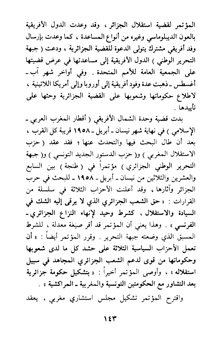 بدت قضية وحدة الشمال الأفريقي (أقطار المغرب العربي - الإسلامي) في نهاية شهر نيسان - أبريل - 1958 قريبة كل القرب، بعد أن طال البحث فيها والتحدث عنها؛ فقد عقد (حزب الاستقلال المغربي) و (حزب الدستور الجديد التونسي) و (جبهة التحرير الوطني الجزائري) مؤتمرا في (طنجة) بين السابع والعشرين والثلاثين من نيسان - أبريل - 1958 - للبحث في حرب الجزائر وآثارها، وقد أعلنت الأحزاب الثلاثة في سلسلة من القرارات: (حق الشعب الجزائري الذي لا يرقى إليه الشك في السيادة والاستقلال، كشرط وحيد لإنهاء النزاع الجزائري - الفرنسي) وهذا يعني أن المؤتمر قد أقر صيغة معدلة، للشرط المسبق الذي وضعته جبهة التحرير. وقرر المؤتمر أيضا: (أن تعمل الأحزاب السياسية الثلاثة على حشد كل ما لدى شعوبها وحكوماتها من قوى لدعم الشعب الجزائري المجاهد في سبيل استقلاله)، وأوصى المؤتمر أخيرا: (بتشكيل حكومة جزائرية بعد التشاور مع الحكومتين التونسية والمغربية - المراكشية).