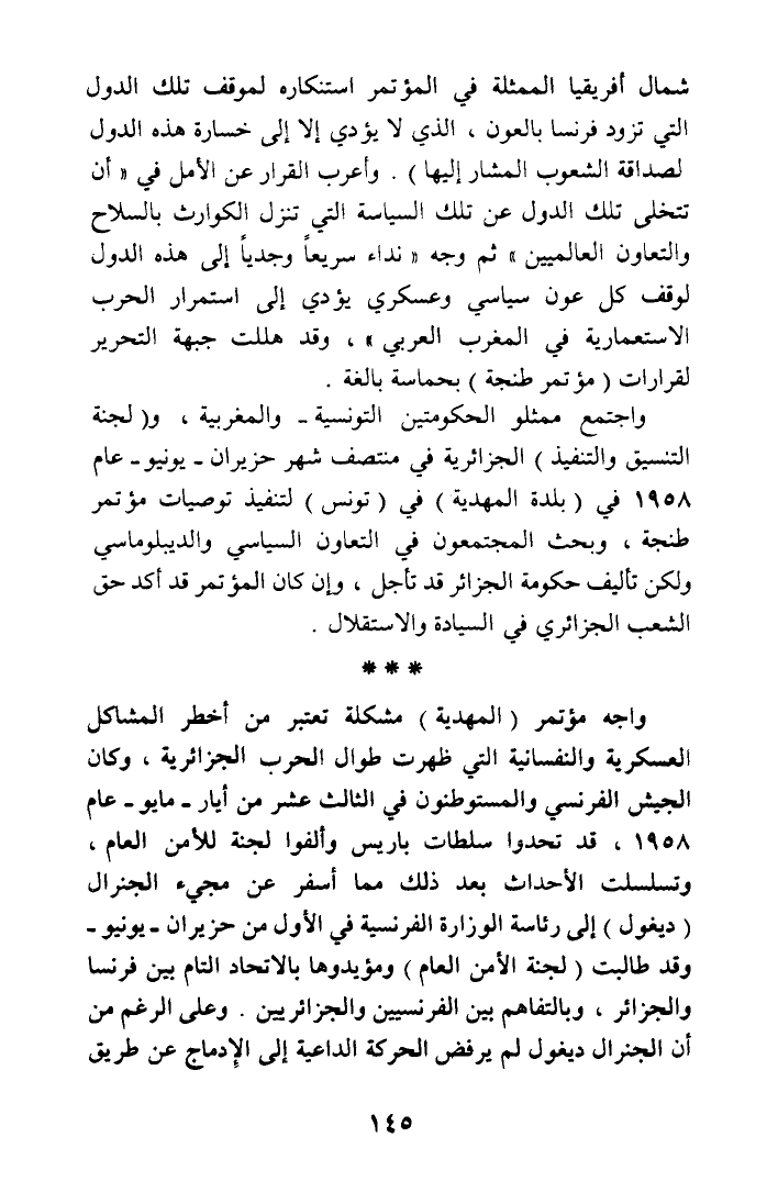 شمال أفريقيا الممثلة في المؤتمر استنكاره لموقف تلك الدول التي تزود فرنسا بالعون، الذي لا يؤدي إلا إلى خسارة هذه الدول لصداقة الشعوب المشار إليها). وأعرب القرار عن الأمل في (أن تتخلى تلك الدول عن تلك السياسة التي تنزل الكوارث بالسلاح والتعاون العالميين) ثم وجه (نداء سريعا وجديا إلى هذه الدول لوقف كل عون سياسي وعسكري يؤدي إلى استمرار الحرب الاستعمارية في المغرب العربي)، وقد هللت جبهة التحرير لقرارات (مؤتمر طنجة) بحماسة بالغة.