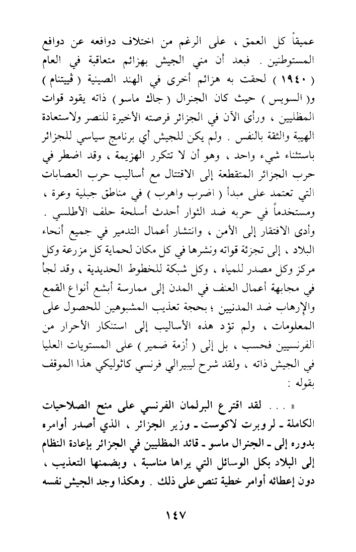 عميقا كل العمق، على الرغم من اختلاف دوافعه عن دوافع المستوطنين. فبعد أن مني الجيش بهزائم متعاقبة في العام (1940) لحقت به هزائم أخرى في الهند الصينية (فييتنام) و (السويس) حيث كان الجنرال (جاك ماسو) ذاته يقود قوات المظليين، ورأى الآن في الجزائر فرصته الأخيرة للنصر ولاستعادة الهيبة والثقة بالنفس. ولم يكن للجيش أي برنامج سياسي للجزائر باستثناء شيء واحد، وهو أن لا تتكرر الهزيمة، وقد اضطر في حرب الجزائر المتقطعة إلى الاقتتال مع أساليب حرب العصابات التي تعتمد على مبدأ (اضرب واهرب) في مناطق جبلية وعرة، ومستخدما في حربه ضد الثوار أحدث أسلحة حلف الأطلسي. وأدى الافتقار إلى الأمن، وانتشار أعمال التدمير في جميع أنحاء البلاد، إلى تجزئة قواته ونشرها في كل مكان لحماية كل مزرعة وكل مركز وكل مصدر للمياه، وكل شبكة للخطوط الحديدية، وقد لجأ في مجابهة أعمال العنف في المدن إلى ممارسة أبشع أنواع القمع والإرهاب ضد المدنيين؛ بحجة تعذيب المشبوهين للحصول على المعلومات، ولم تؤد هذه الأساليب إلى استنكار الأحرار من الفرنسيين فحسب، بل إلى (أزمة ضمير) على المستويات العليا في الجيش ذاته، ولقد شرح ليبيرالي فرنسي كاثوليكي هذا الموقف بقوله: