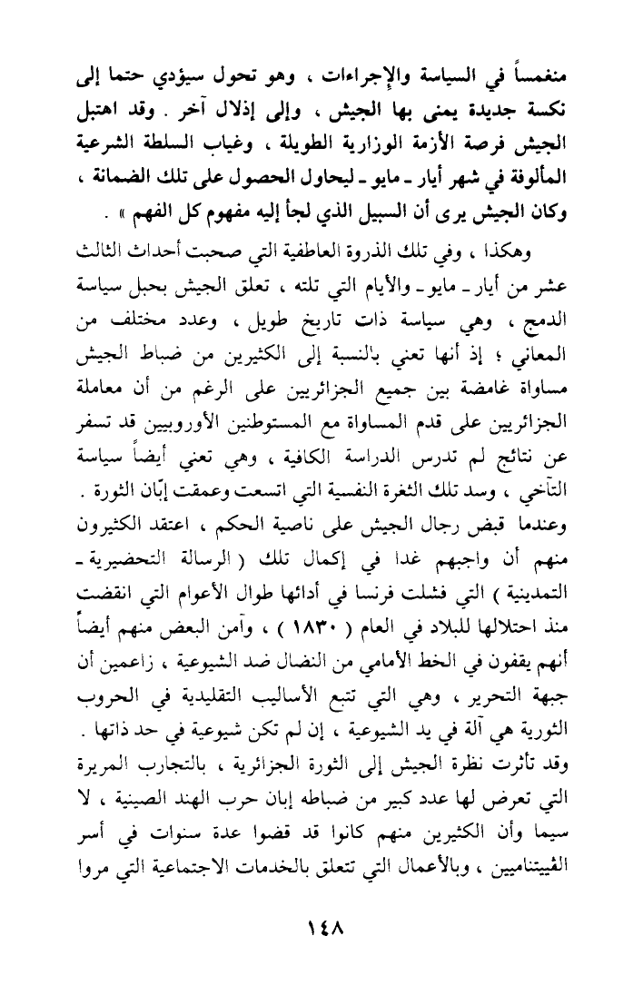 وهكذا، وفي تلك الذروة العاطفية التي صحبت أحداث الثالث عشر من أيار - مايو - والأيام التي تلته، تعلق الجيش بحبل سياسة الدمج، وهي سياسة ذات تاريخ طويل، وعدد مختلف من المعاني؛ إذ أنها تعني بالنسبة إلى الكثيرين من ضباط الجيش مساواة غامضة بين جميع الجزائريين على الرغم من أن معاملة الجزائريين على قدم المساواة مع المستوطنين الأوروبيين قد تسفر عن نتائج لم تدرس الدراسة الكافية، وهي تعني أيضا سياسة التآخي، وسد تلك الثغرة النفسية التي اتسعت وعمقت إبان الثورة. وعندما قبض رجال الجيش على ناصية الحكم، اعتقد الكثيرون منهم أن واجبهم غدا في إكمال تلك (الرسالة التحضيرية - التمدينية) التي فشلت فرنسا في أدائها طوال الأعوام التي انقضت منذ احتلالها للبلاد في العام (1830)، وآمن البعض منهم أيضا أنهم يقفون في الخط الأمامي من النضال ضد الشيوعية، زاعمين أن جبهة التحرير، وهي التي تتبع الأساليب التقليدية في الحروب الثورية هي آلة في يد الشيوعية، إن لم تكن شيوعية في حد ذاتها. وقد تأثرت نظرة الجيش إلى الثورة الجزائرية، بالتجارب المريرة التي تعرض لها عدد كبير من ضباطه إبان حرب الهند الصينية، لا سيما وأن الكثيرين منهم كانوا قد قضوا عدة سنوات في أمر الفييتناميين، وبالأعمال التي تتعلق بالخدمات الاجتماعية التي مروا