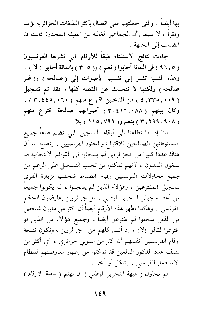 إننا إذا ما تطلعنا إلى أرقام النسجيل التي تضم طبعا جميع المستوطنين الصالحين للاقتراع والجنود الفرنسيين، يتضح لنا أن هناك عددا كبيرا من الجزائريين لم يسجلوا في القوائم الانتخابية قد يبلغون المليون، لأنهم تمكنوا من تجنب التسجيل على الرغم من جميع محاولات الفرنسيين وقيام الضباط شخصيا بزيارة القرى لتسجيل المقترعين، وهؤلاء الذين لم يسجلوا، لم يكونوا جميعا من أعضاء جيش التحرير الوطني، بل جزائريين يعارضون الحكم الفرنسي. وهكذا تظهر هذه الأرقام أيضا أن أكثر من مليون شخص من الذين سجلوا لم يقترعوا أيضا، وجميع هؤلاء من الذين لو اقترعوا لقالوا (لا)؛ إذ أنهم كلهم من الجزائريين، وتكون نتيجة أرقام الفرنسيين أنفسهم أن أكثر من مليوني جزائري، أي أكثر من نصف عدد الذكور البالغين قد تمكنوا من إظهار معارضتهم للنظام الاستعمار الفرنسي، بشكل أو بآخر.