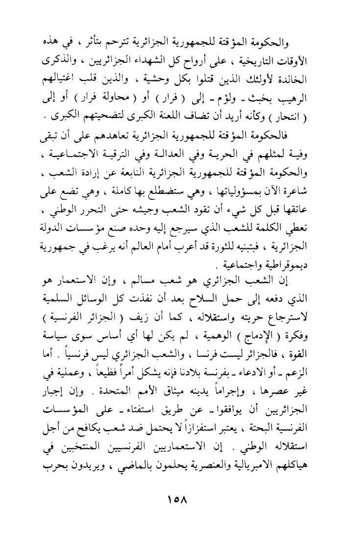 إن الشعب الجزائري هو شعب مسالم، وإن الاستعمار هو الذي دفعه إلى حمل السلاح بعد أن نفذت كل الوسائل السلمية لاسترجاع حريته واستقلاله، كما أن زيف (الجزائر الفرنسية) وفكرة (الإدماج) الوهمية، لم يكن لها أي أساس سوى سياسة القوة، فالجزائر ليست فرنسا، والشعب الجزائري ليس فرنسيا. أما الزعم - أو الادعاء - بفرنسة بلادنا فإنه يشكل أمرا فظيعا، وعملية في غير عصرها، وإجراما يدينه ميثاق الأمم المتحدة. وإن إجبار الجزائريين أن يوافقوا - عن طريق استفتاء - على المؤسسات الفرنسية البحتة، يعتبر استفزازا لا يحتمل ضد شعب يكافح من أجل استقلاله الوطني. إن الاستعماريين الفرنسيين المنتخبين في هياكلهم الامبريالية والعنصرية يحلمون بالماضي، ويريدون بحرب