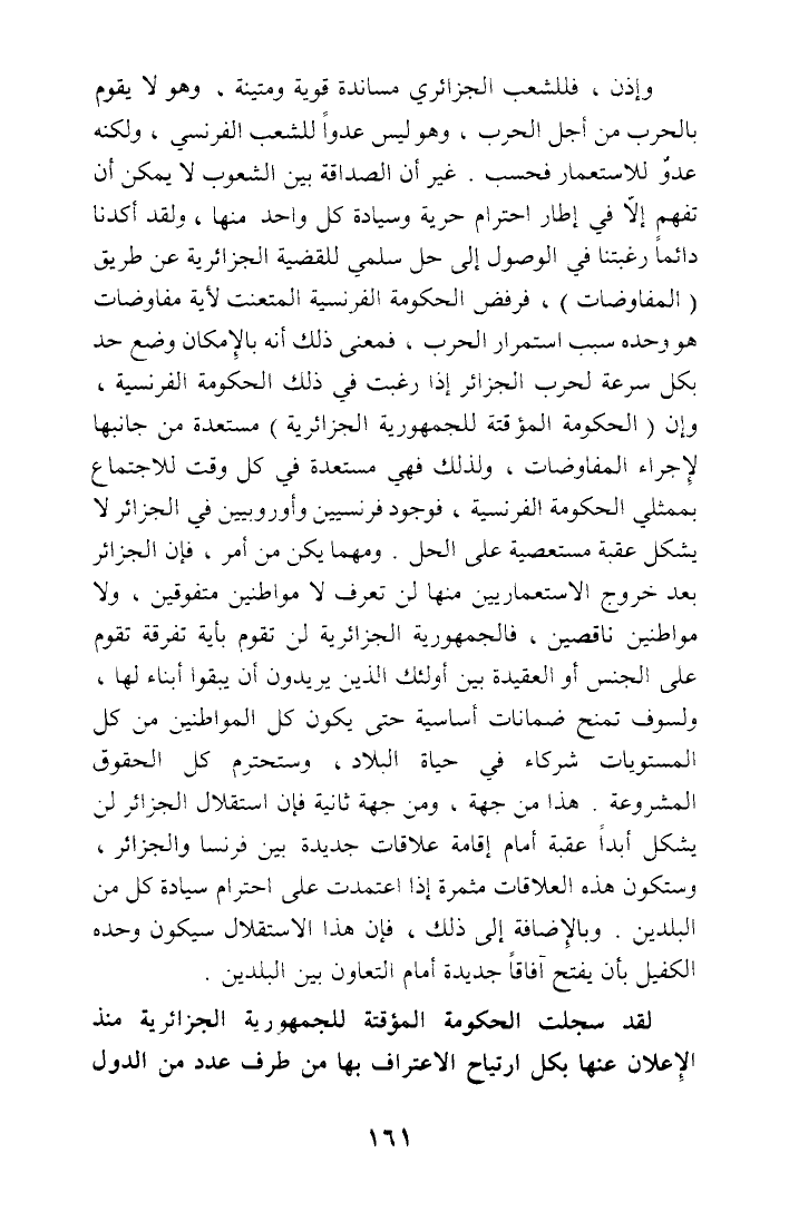 وإذن، فللشعب الجزائري مساندة قوية ومتينة، وهو لا يقوم بالحرب من أجل الحرب، وهو ليس عدوا للشعب الفرنسي، ولكنه عدو للاستعمار فحسب. غير أن الصداقة بين الشعوب لا يمكن أن تفهم إلا في إطار احترام حرية وسيادة كل واحد منها، ولقد أكدنا دائما رغبتنا في الوصول إلى حل سلمي للقضية الجزائرية عن طريق (المفاوضات)، فرفض الحكومة الفرنسية المتعنت لأية مفاوضات هو وحده سبب استمرار الحرب، فمعنى ذلك أنه بالإمكان وضع حد بكل سرعة لحرب الجزائر إذا رغبت في ذلك الحكومة الفرنسية، وإن (الحكومة المؤقتة للجمهورية الجزائرية) مستعدة من جانبها لإجراء المفاوضات، ولذلك فهي مستعدة في كل وقت للاجتماع بممثلي الحكومة الفرنسية، فوجود فرنسيين وأوروبيين في الجزائر لا يشكل عقبة مستعصية على الحل. ومهما يكن من أمر، فإن الجزائر بعد خروج الاستعماريين منها لن تعرف لا مواطنين متفوقين، ولا مواطنين ناقصين، فالجمهورية الجزائرية لن تقوم بأية تفرقة تقوم على الجنس أو العقيدة بين أولئك الذين يريدون أن يبقوا أبناء لها، ولسوف تمنح ضمانات أساسية حتى يكون كل المواطنين من كل المستويات شركاء في حياة البلاد، وستحترم كل الحقوق المشروعة. هذا من جهة، ومن جهة ثانية فإن استقلال الجزائر لن يشكل أبدا عقبة أمام إقامة علاقات جديدة بين فرنسا والجزائر، وستكون هذه العلاقات مثمرة إذا اعتمدت على احترام سيادة كل من البلدين. وبالإضافة إلى ذلك، فإن هذا الاستقلال سيكون وحده الكفيل بأن يفتح آفاقا جديدة أمام التعاون بين البلدين.