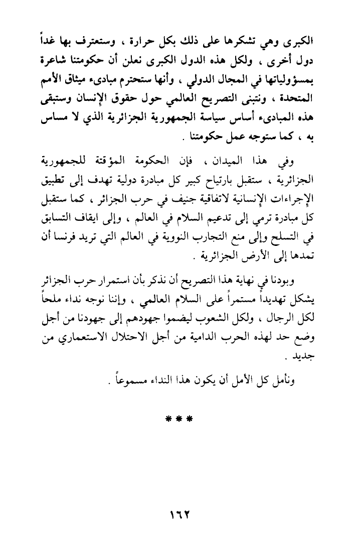 الكبرى وهي تشكرها على ذلك بكل حرارة، وستعترف بها غدا دول أخرى، ولكل هذه الدول الكبرى نعلن أن حكومتنا شاعرة بمسؤولياتها في المجال الدولي، وأنها ستحترم مبادىء ميثاق الأمم المتحدة، ونتبنى التصريح العالمي حول حقوق الإنسان وستبقى هذه المبادىء أساس سياسة الجمهورية الجزائرية الذي لا مساس به، كما ستوجه عمل حكومتنا.