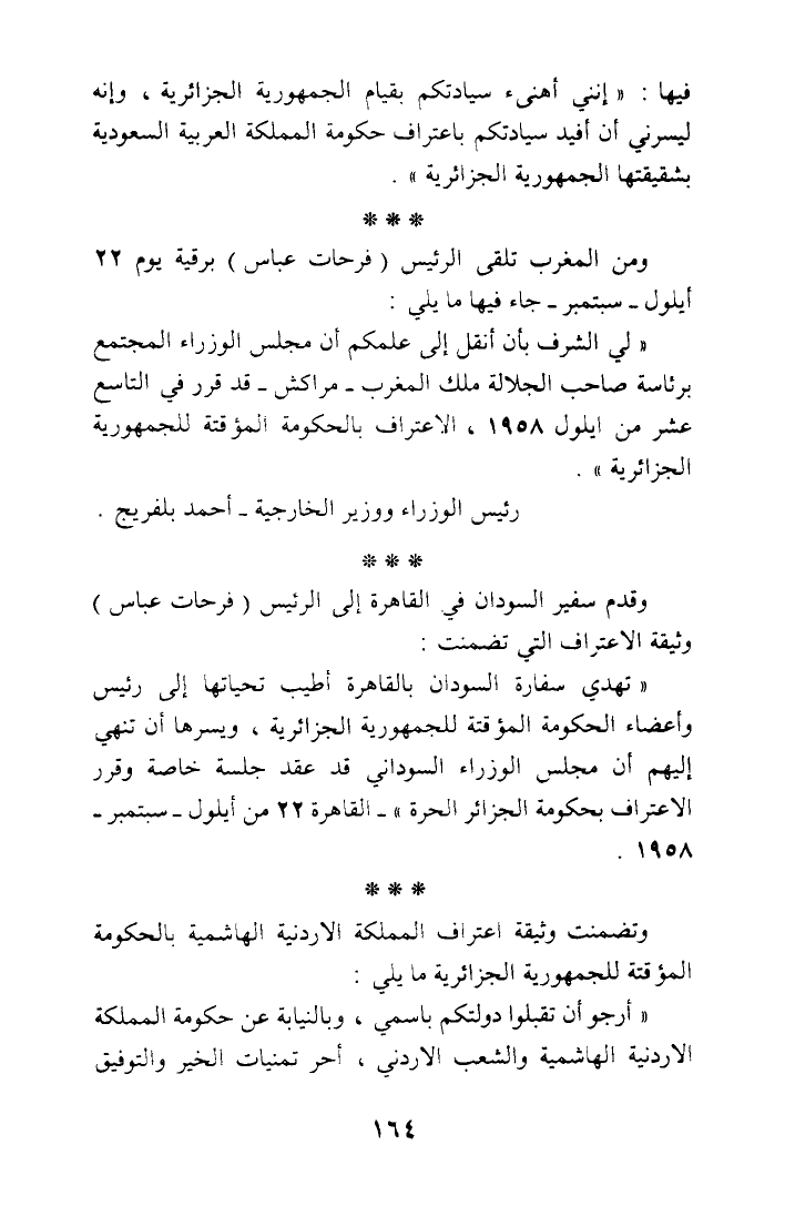 ومن المغرب تلقى الرئيس (فرحات عباس) برقية يوم 22 أيلول - سبتمبر - جاء فيها ما يلي: