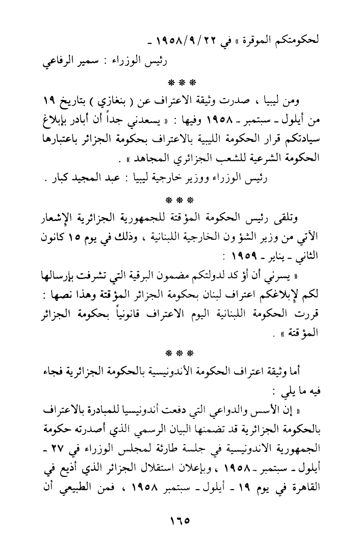 (يسرني أن أؤكد لدولتكم مضمون البرقية التي تشرفت بإرسالها لكم لإبلاغكم اعتراف لبنان بحكومة الجزائر المؤقتة وهذا نصها: قررت الحكومة اللبنانية اليوم الاعتراف قانونيا بحكومة الجزائر المؤقتة).