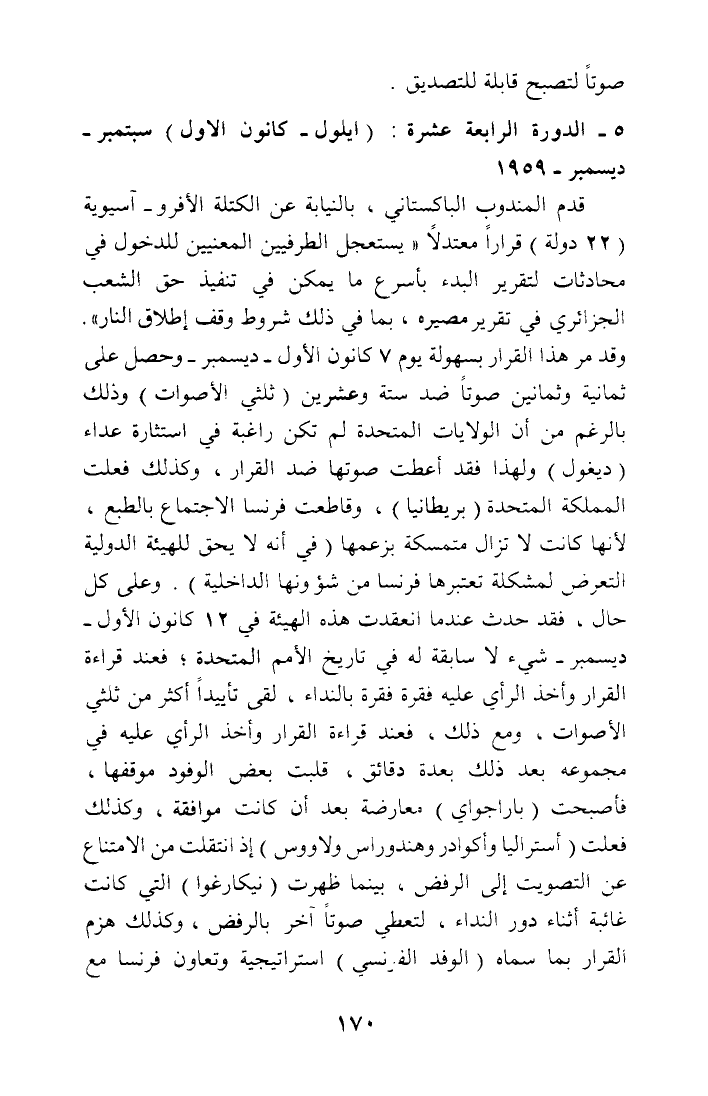 قدم المندوب الباكستاني، بالنيابة عن الكتلة الأفرو - آسيوية (22 دولة) قرارا معتدلا (يستعجل الطرفيين المعنيين للدخول في محادثات لتقرير البدء بأسرع ما يمكن في تنفيذ حق الشعب الجزائري في تقرير مصيره، بما في ذلك شروط وقف إطلاق النار). وقد مر هذا القرار بسهولة يوم 7 كانون الأول - ديسمبر - وحصل على ثمانية وثمانين صوتا ضد ستة وعشرين (ثلثي الأصوات) وذلك بالرغم من أن الولايات المتحدة لم تكن راغبة في استثارة عداء (ديغول) ولهذا فقد أعطت صوتها ضد القرار، وكذلك فعلت المملكة المتحدة (بريطانيا)، وقاطعت فرنسا الاجتماع بالطبع، لأنها كانت لا تزال متمسكة بزعمها (في أنه لا يحق للهيئة الدولية التعرض لمشكلة تعتبرها فرنسا من شؤونها الداخلية). وعلى كل حال، فقد حدث عندما انعقدت هذه الهيئة في 12 كانون الأول -ديسمبر - شيء لا سابقة له في تاريخ الأمم المتحدة؛ فعند قراءة القرار وأخذ الرأي عليه فقرة فقرة بالنداء، لقى تأييدا أكثر من ثلثي الأصوات، ومع ذلك، فعند قراءة القرار وأخذ الرأي عليه في مجموعه بعد ذلك بعدة دقائق، قلبت بعض الوفود موقفها، فأصبحت (باراجواي) معارضة بعد أن كانت موافقة، وكذلك فعلت (أستراليا وأكوادر وهندوراس ولاووس) إذ انتقلت من الامتناع عن التصويت إلى الرفض، بينما ظهرت (نيكارغوا) التي كانت غائبة أثناء دور النداء، لتعطي صوتا آخر بالرفض، وكذلك هزم القرار بما سماه (الوفد الفرنسي) استراتيجية وتعاون فرنسا مع