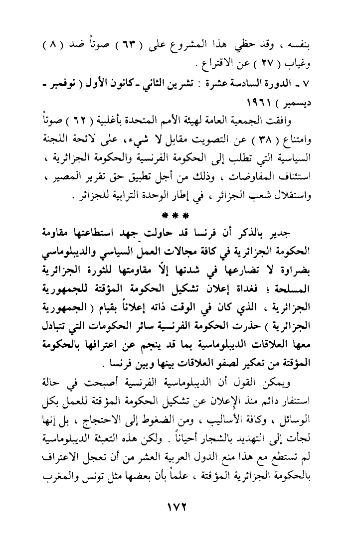 وافقت الجمعية العامة لهيئة الأمم المتحدة بأغلبية (62) صوتا وامتناع (38) عن التصويت مقابل لا شيء، على لائحة اللجنة السياسية التي تطلب إلى الحكومة الفرنسية والحكومة الجزائرية، استئناف المفاوضات، وذلك من أجل تطبيق حق تقرير المصير، واستقلال شعب الجزائر، في إطار الوحدة الترابية للجزائر.
