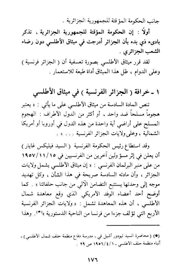 أولا: إن الحكومة المؤقتة للجمهورية الجزائرية، تذكر بادىء ذي بدء بأن الجزائر أدرجت في ميثاق الأطلسي دون رضاء الشعب الجزائري.