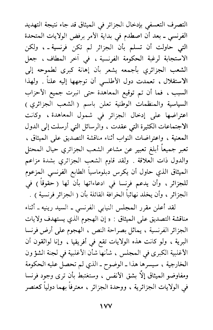 لقد أعلن مقرر المجلس النيابي الفرنسي - السيد رينيه - أثناء مناقشة التصديق على الميثاق: (إن الهجوم الذي يستهدف ولايات الجزائر الفرنسية، يماثل بصراحة النص، الهجوم على أرض فرنسا البرية، ولو كانت هذه الولايات تقع في أفريقيا، وإنا لواثقون أن الأغلبية الكبرى في المجلس، شأنها شأن الأغلبية في لجنة الشؤون الخارجية، سيسرها هذا - الوضوح - الذي لم تحصل عليه الحكومة ومفاوضو الميثاق إلا بشق الأنفس، وستغتبط بأن ترى وجود فرنسا في الولايات الجزائرية، ووحدة الجزائر، معترفا بهما دوليا كعنصر