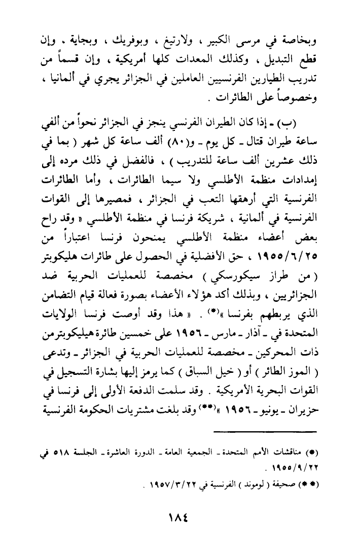 (ب) - إذا كان الطيران الفرنسي ينجز في الجزائر نحوا من ألفي ساعة طيران قتال - كليوم - و (80) ألف ساعة كل شهر (بما في ذلك عشرين ألف ساعة للتدريب)، فالفضل في ذلك مرده إلى إمدادات منظمة الأطلسي ولا سيما الطائرات، وأما الطائرات الفرنسية التي أرهقها التعب في الجزائر، فمصيرها إلى القوات الفرنسية في ألمانية، شريكة فرنسا في منظمة الأطلسي (وقد راح بعض أعضاء منظمة الأطلسي يمنحون فرنسا اعتبارا من 25/ 6/ 1955، حق الأفضلية في الحصول على طائرات هليكوبتر (من طراز سيكورسكي) مخصصة للعمليات الحربية ضد الجزائريين، وبذلك أكد هؤلاء الأعضاء بصورة فعالة قيام التضامن الذي يربطهم بفرنسا) (*). (هذا وقد أوصت فرنسا الولايات المتحدة في - آذار - مارس - 1956 على خمسين طائرة هيليكوبتر من ذات المحركين - مخصصة للعمليات الحربية في الجزائر - وتدعى (الموز الطائر) أو (خيل السباق) كما يرمز إليها بشارة السبيل في القوات البحرية الأمريكية. وقد سلمت الدفعة الأولى إلى فرنسا في حزيران - يونيو - 1956) (**) وقد بلغت مشتريات الحكومة الفرنسية