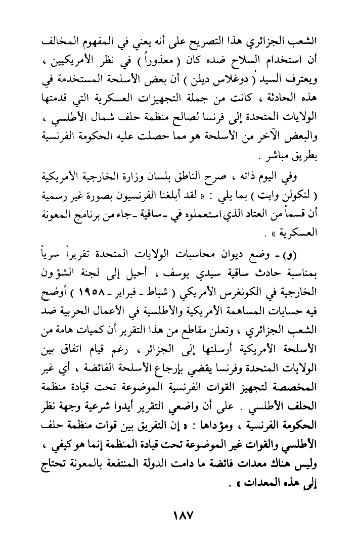 (و) - وضع ديوان محاسبات الولايات المتحدة تقريرا سريا بمناسبة حادث ساقية سيدي يوسف، أحيل إلى لجنة الشؤون الخارجية في الكونغرس الأمريكي (شباط - فبراير - 1958) أوضح فيه حسابات المساهمة الأمريكية والأطلسية في الأعمال الحربية ضد الشعب الجزائري، وتعلن مقاطع من هذا التقرير أن كميات هامة من الأسلحة الأمريكية أرسلتها إلى الجزائر، رغم قيام اتفاق بين الولايات المتحدة وفرنسا يقضي بإرجاع الأسلحة الفائضة، أي غير المخصصة لتجهيز القوات الفرنسية الموضوعة تحت قيادة منظمة الحلف الأطلسي. على أن واضعي التقرير أيدوا شرعية وجهة نظر الحكومة الفرنسية، ومؤداها: (إن التفريق بين قوات منظمة حلف الأطلسي والقوات غير الموضوعة تحت قيادة المنظمة إنما هو كيفي، وليس هناك معدات فائضة ما دامت الدولة المنتفعة بالمعونة تحتاج إلى هذه المعدات).
