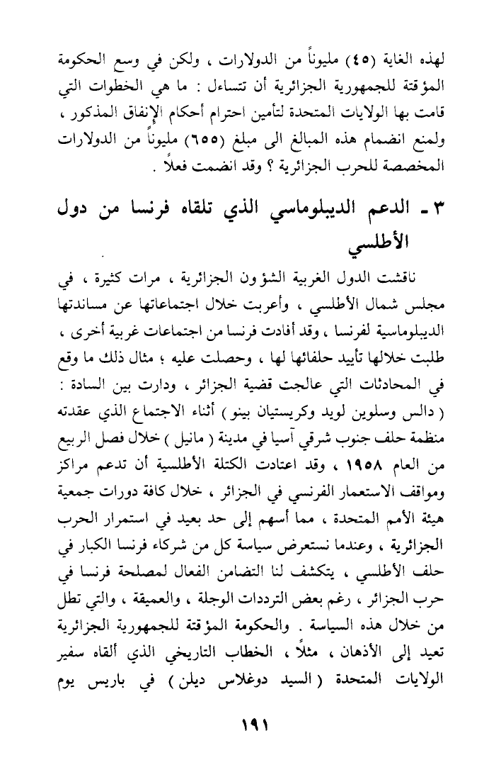 لهذه الغاية (45) مليونا من الدولارات، ولكن في وسع الحكومة المؤقتة للجمهورية الجزائرية أن تتساءل: ما هي الخطوات التي قامت بها الولايات المتحدة لتأمين احترام أحكام الإنفاق المذكور، ولمنع انضمام هذه المبالغ الى مبلغ (655) مليونا من الدولارات المخصصة للحرب الجزائرية؟ وقد انضمت فعلا.