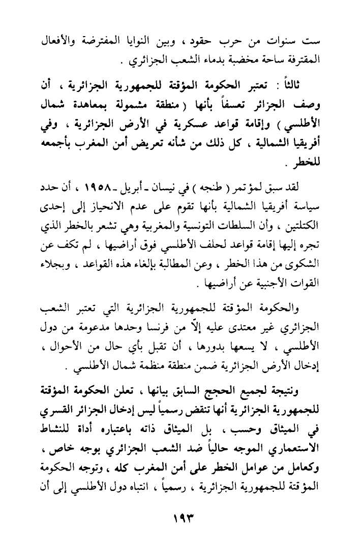ثالثا: تعتبر الحكومة المؤقتة للجمهورية الجزائرية، أن وصف الجزائر تعسفا بأنها (منطقة مشمولة بمعاهدة شمال الأطلسي) وإقامة قواعد عسكرية في الأرض الجزائرية، وفي أفريقيا الشمالية، كل ذلك من شأنه تعريض أمن المغرب بأجمعه للخطر.
