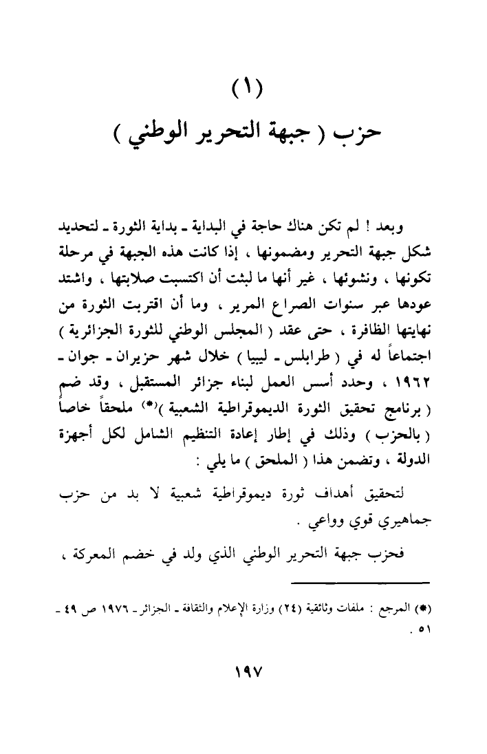 وبعد! لم تكن هناك حاجة في البداية - بداية الثورة - لتحديد شكل جبهة التحرير ومضمونها، إذا كانت هذه الجبهة في مرحلة تكونها، ونشوئها، غير أنها ما لبثت أن اكتسبت صلابتها، واشتد عودها عبر سنوات الصراع المرير، وما أن اقتربت الثورة من نهايتها الظافرة، حتى عقد (المجلس الوطني للثورة الجزائرية) اجتماعا له في (طرابلس - ليبيا) خلال شهر حزيران - جوان -1962، وحدد أسس العمل لبناء جزائر المستقبل، وقد ضم (برنامج تحقيق الثورة الديموقراطية الشعبية) (*) ملحقا خاصا (بالحزب) وذلك في إطار إعادة التنظيم الشامل لكل أجهزة الدولة، وتضمن هذا (الملحق) ما يلي:
