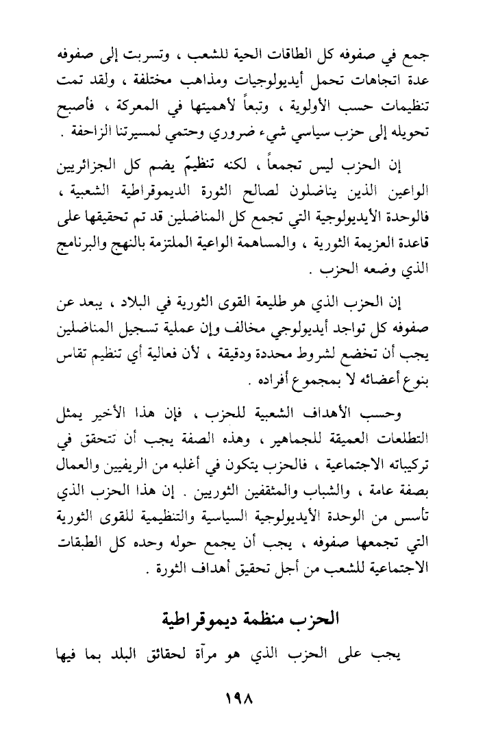 إن الحزب ليس تجمعا، لكنه تنظيم يضم كل الجزائريين الواعين الذين يناضلون لصالح الثورة الديموقراطية الشعبية، فالوحدة الأيديولوجية التي تجمع كل المناصلين قد تم تحقيقها على قاعدة العزيمة الثورية، والمساهمة الواعية الملتزمة بالنهج والبرنامج الذي وضعه الحزب.
