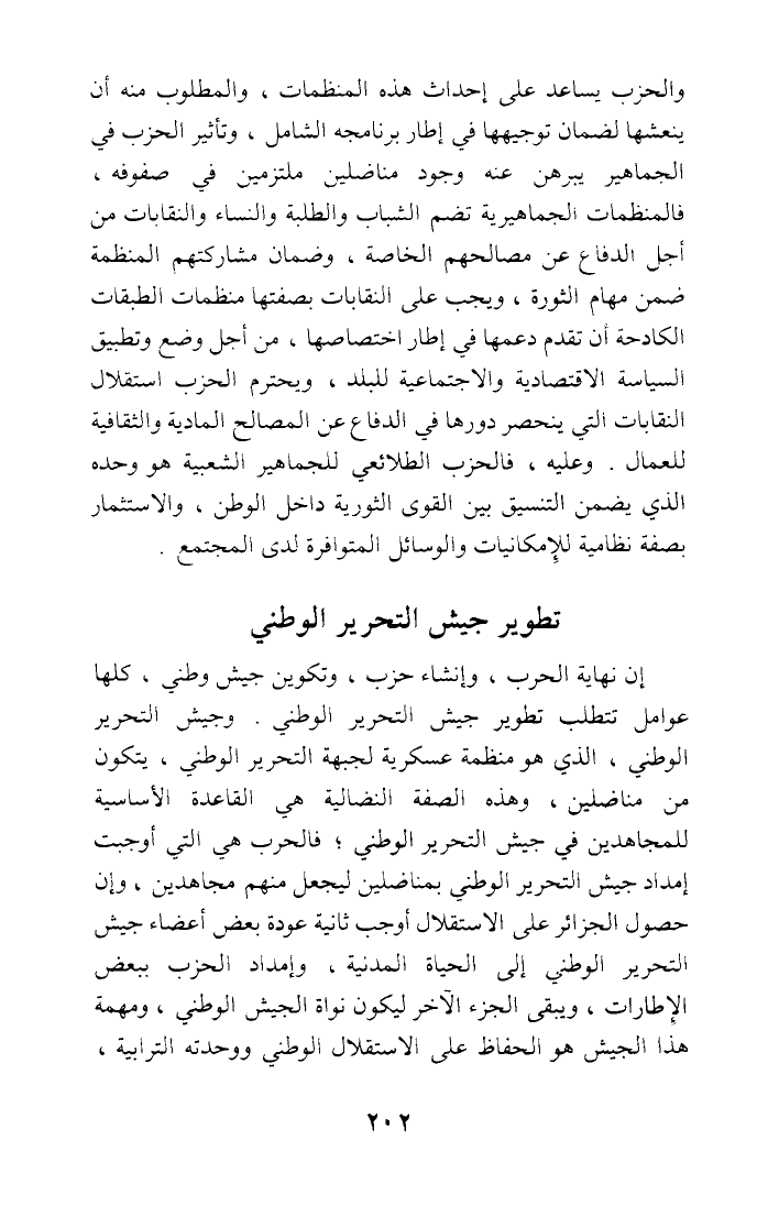 الوطني، الذي هو منظمة عسكرية لجبهة التحرير الوطني، يتكون من مناضلين، وهذه الصفة النضالية هي القاعدة الأساسية للمجاهدين في جيش التحرير الوطني؛ فالحرب هي التي أوجبت إمداد جيش التحرير الوطني بمناضلين ليجعل منهم مجاهدين، وإن حصول الجزائر على الاستقلال أوجب ثانية عودة بعض أعضاء جيش التحرير الوطني إلى الحياة المدنية، وإمداد الحزب ببعض الإطارات، ويبقى الجزء الآخر ليكون نواة الجيش الوطني، ومهمة هذا الجيش هو الحفاظ على الاستقلال الوطني ووحدته الترابية،