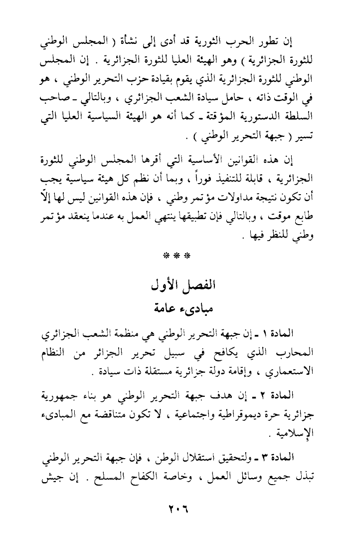 المادة 1 - إن جبهة التحرير الوطني هي منظمة الشعب الجزائري المحارب الذي يكافح في سبيل تحرير الجزائر من النظام الاستعماري، وإقامة دولة جزائرية مستقلة ذات سيادة.